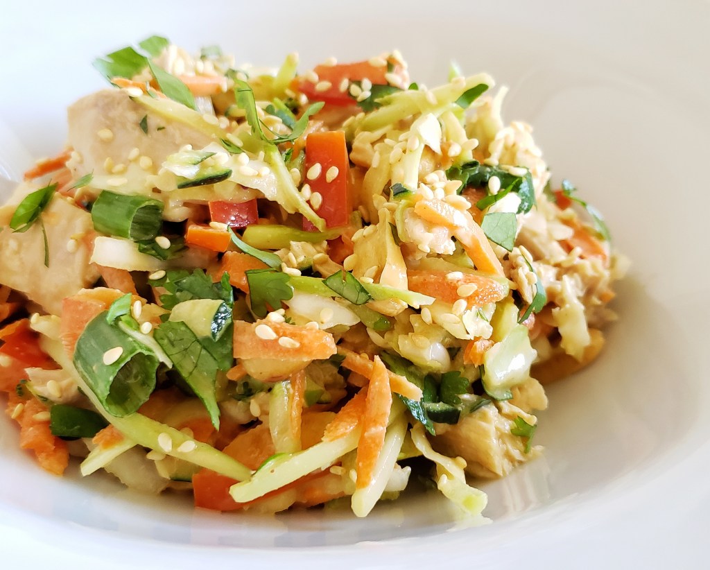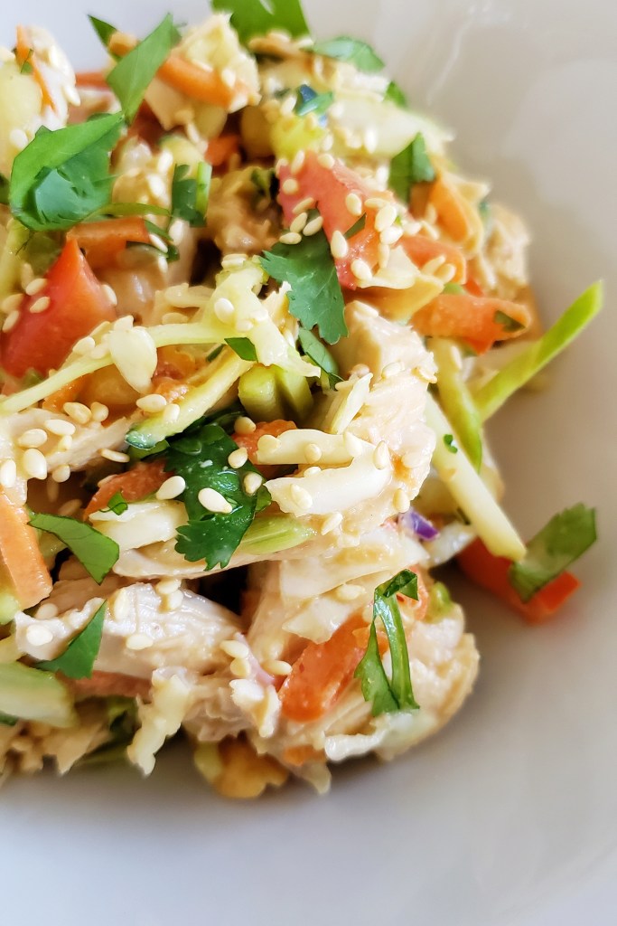 Today’s chicken salad has an Asian flair! Sometimes you just crave salads, especially as the summer temperatures warm up. This one is a great alternative to standard tossed salads, loaded with protein, healthy veggies, and tossed in a versatile Thai peanut dressing.