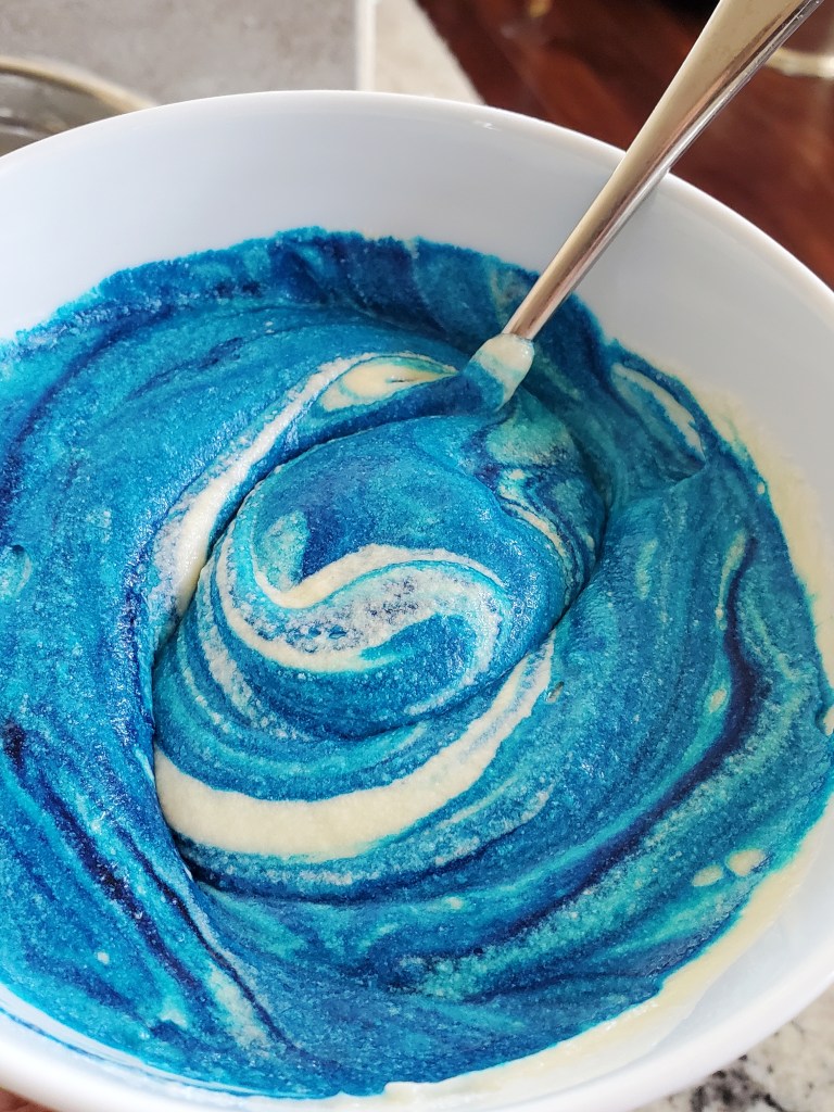 Evenly divide the batter between 6 small bowls (a little over 1 cup each). Dye each bowl with one color of food coloring. Stir only until the color is uniform; be careful not to overmix the batter, or it will be dense.