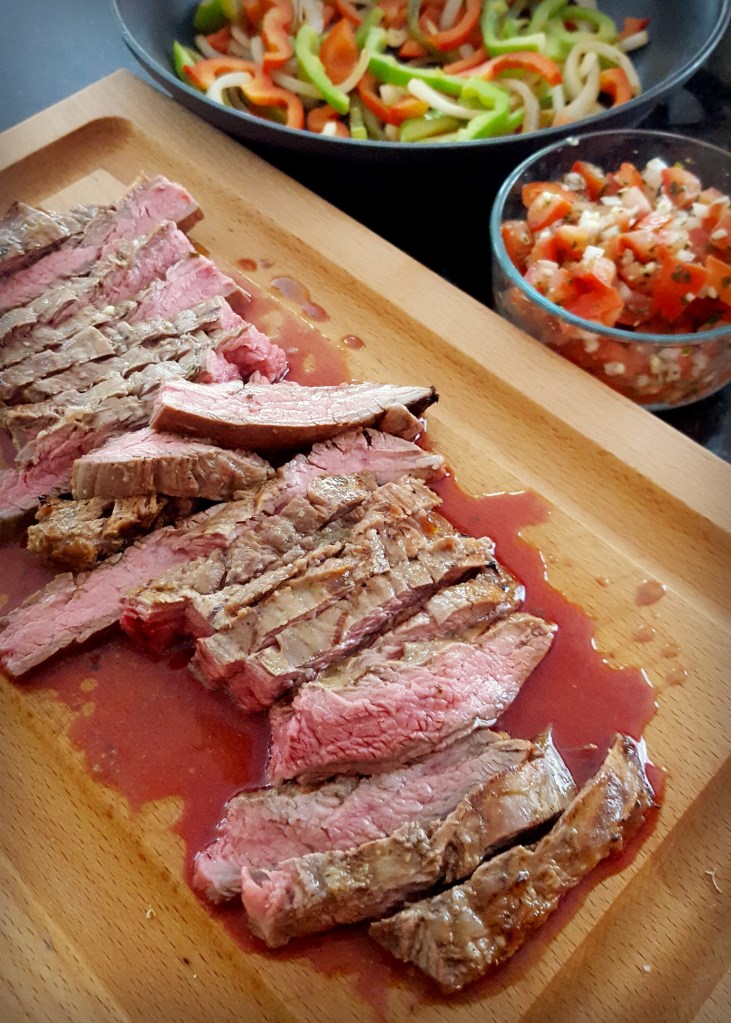 Remove the steak from the fridge 30 minutes prior to cooking so it can come to room temperature. Grill the steak on an outdoor grill according to your doneness preferences. Remove from the heat and let it rest for 10 minutes before slicing into strips.