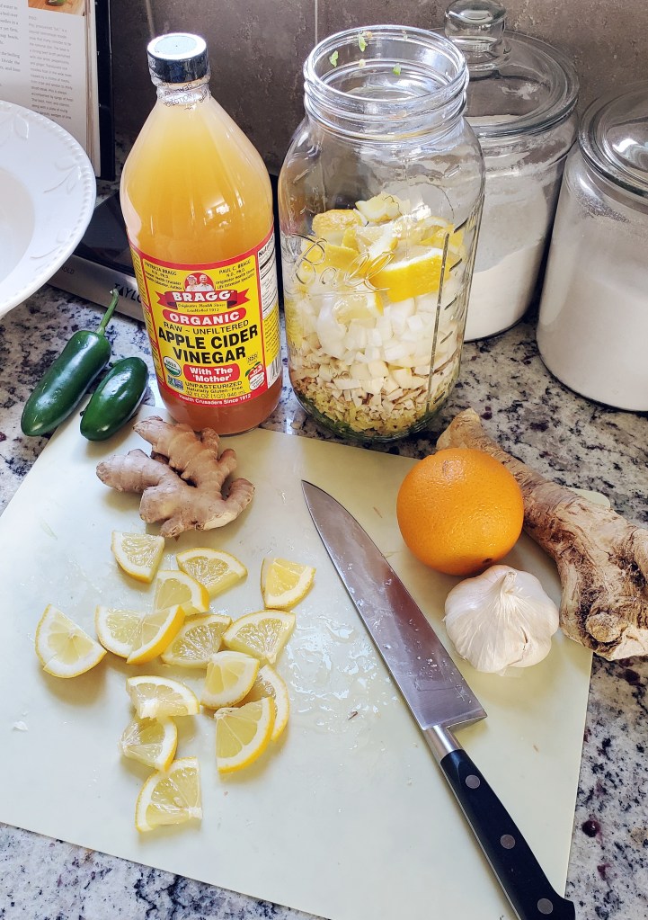 The concept is simple: cut up chunks of foods known for antibacterial, antimicrobial, and antiviral properties and steep them in apple cider vinegar until it creates a tincture that can be taken in shots. Fire Cider takes 4-6 weeks to properly set up, so this tonic requires a little planning.