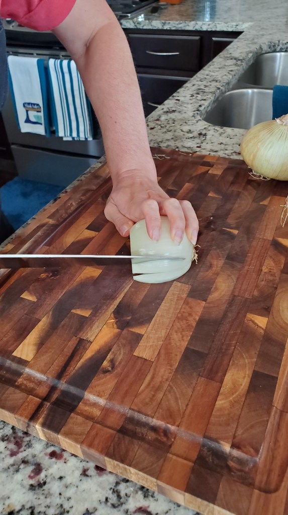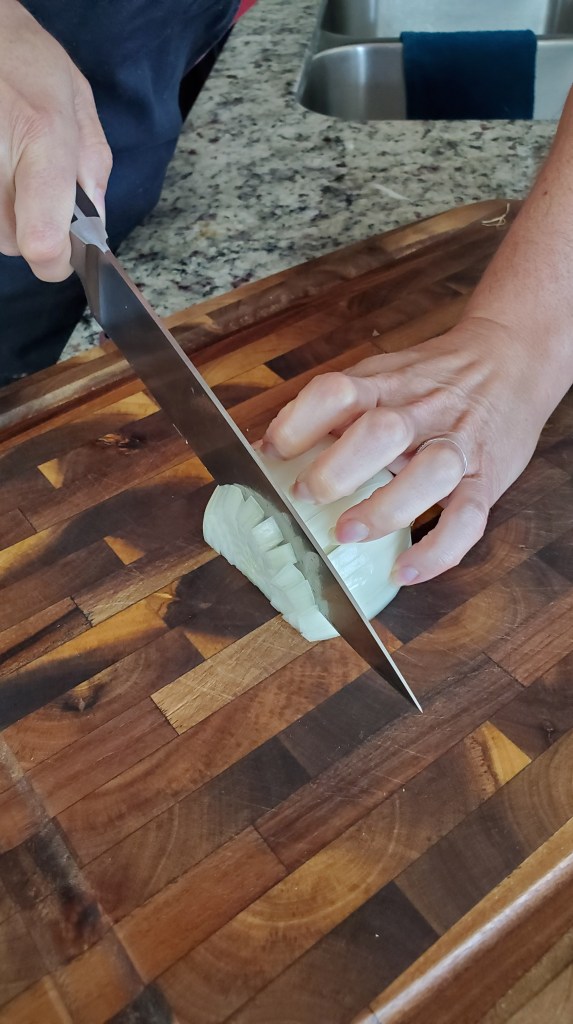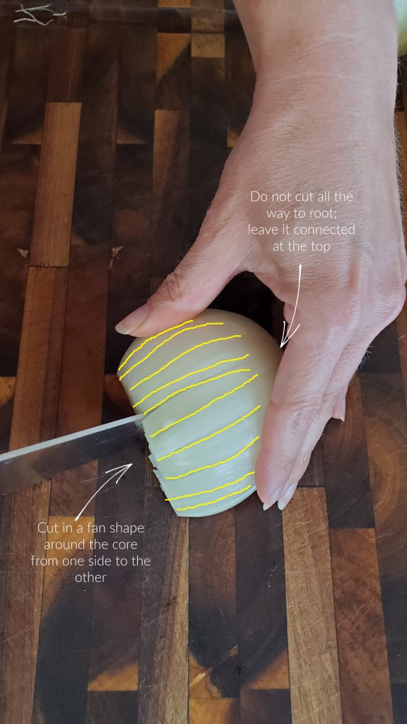 To dice the onion, cut inward toward the center of the onion across in a fan shape from one side to the other. Do not cut all the way up to through the root end. Use that end to keep the onion slices connected to each other.