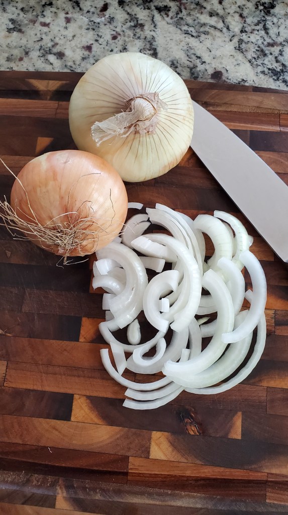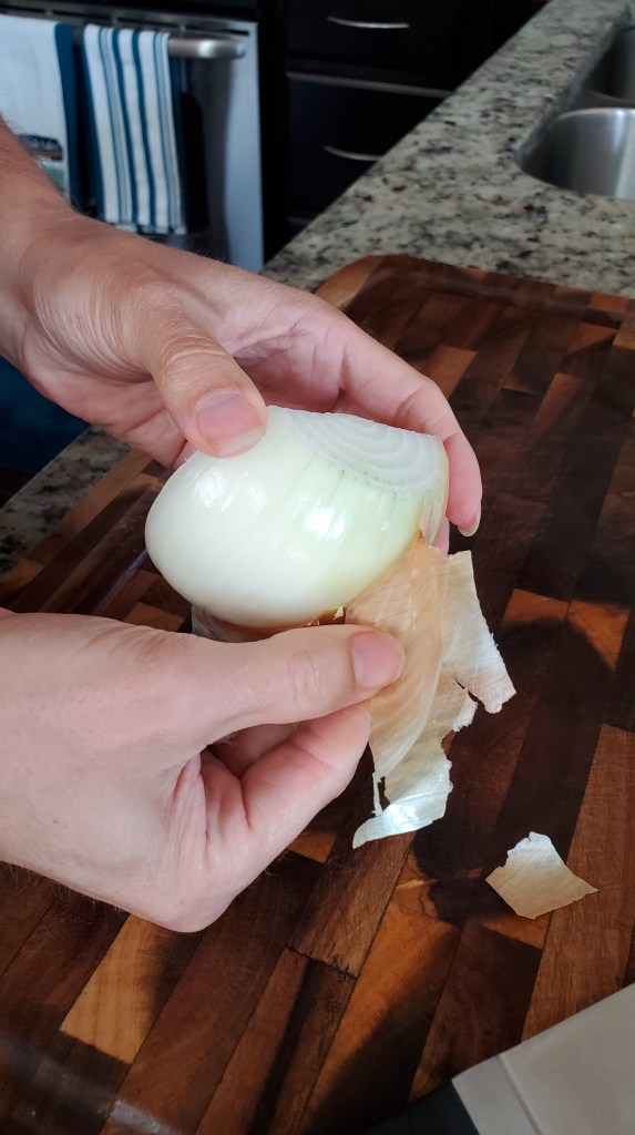 Next, slice the onion in half down the center, peel off the outer layer of skin, and place the onion face down on the newly cut side.