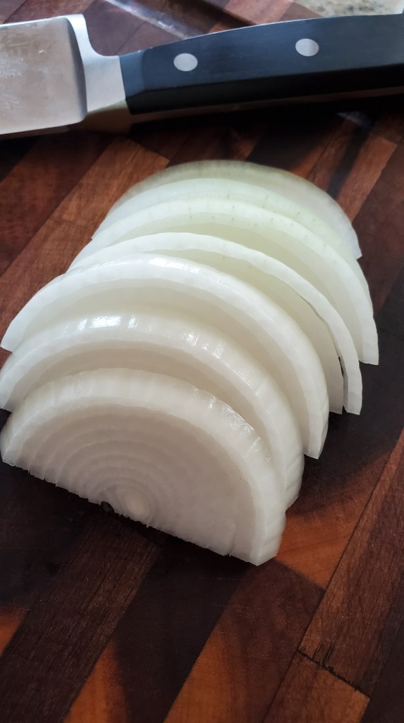 For longer onion slices, simply slice parallel to the flat bottom end you just cut. Discard the top and use the slices.