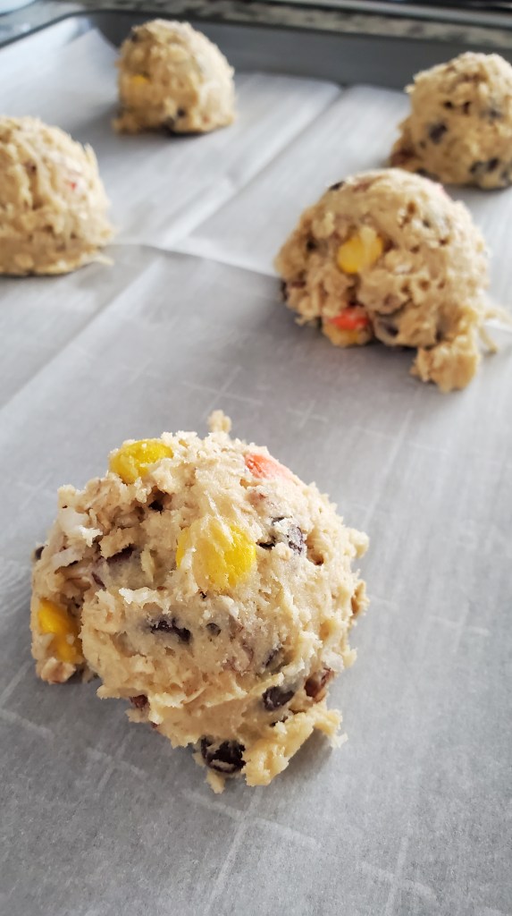 Mix the dry ingredients into the wet ingredients by hand slowly, and stop just before it’s fully incorporated. Add the oats, pecans, coconut, Reese’s Pieces, and chocolate chips to the bowl. Fold in gently. Don’t over mix, it will make your dough tough.