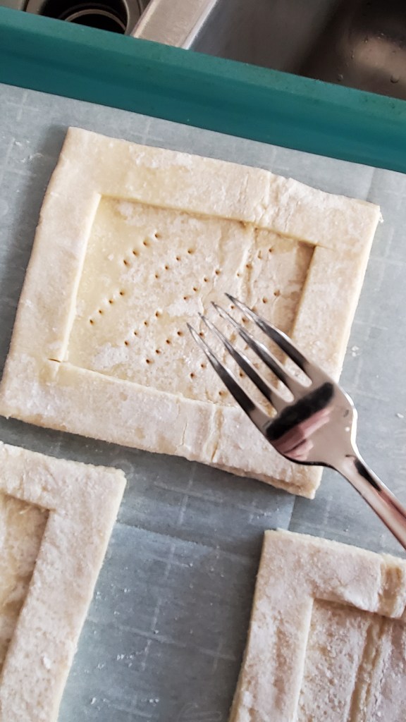 Use a fork to dock (poke holes all over) the center portion of the puff pastry. The holes will allow more moisture to evaporate from the center so it doesn’t puff up too much.
