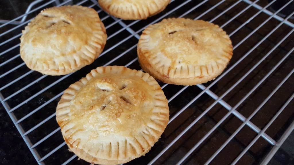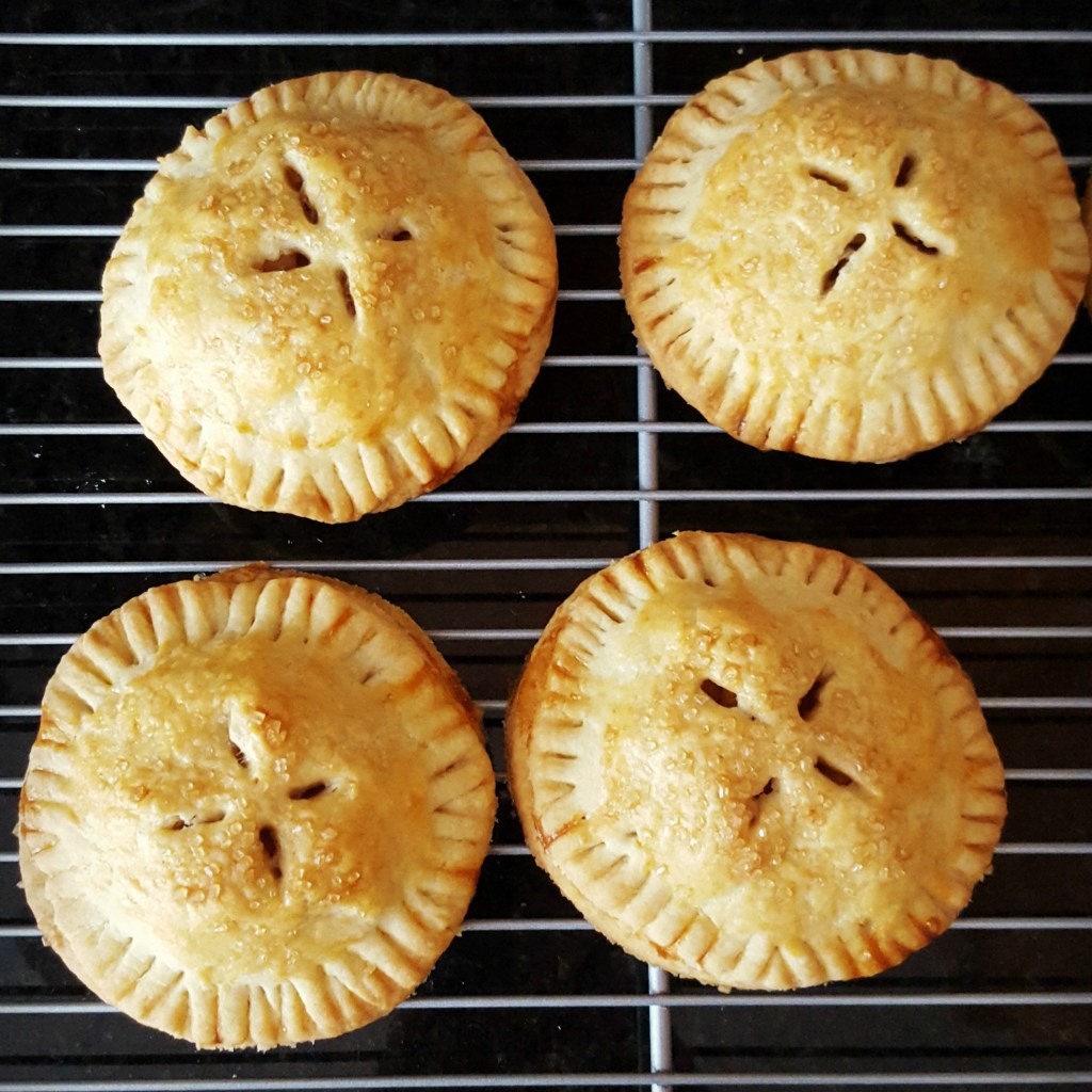 Brush each pie with the egg wash, and using a sharp knife, cut two or three vents on the top of each pie. Sprinkle the pies with turbinado sugar.