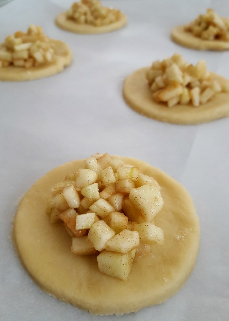 Place six of the dough circles on a Silpat or parchment paper-lined cookie sheet. Spoon a small portion of the apple filling into the center of each circle, leaving enough of a border around the filling. Top the apple filling with a pinch of sea salt. Place a second dough circle atop each filled circle then use a fork to crimp the edges together, sealing each pie.