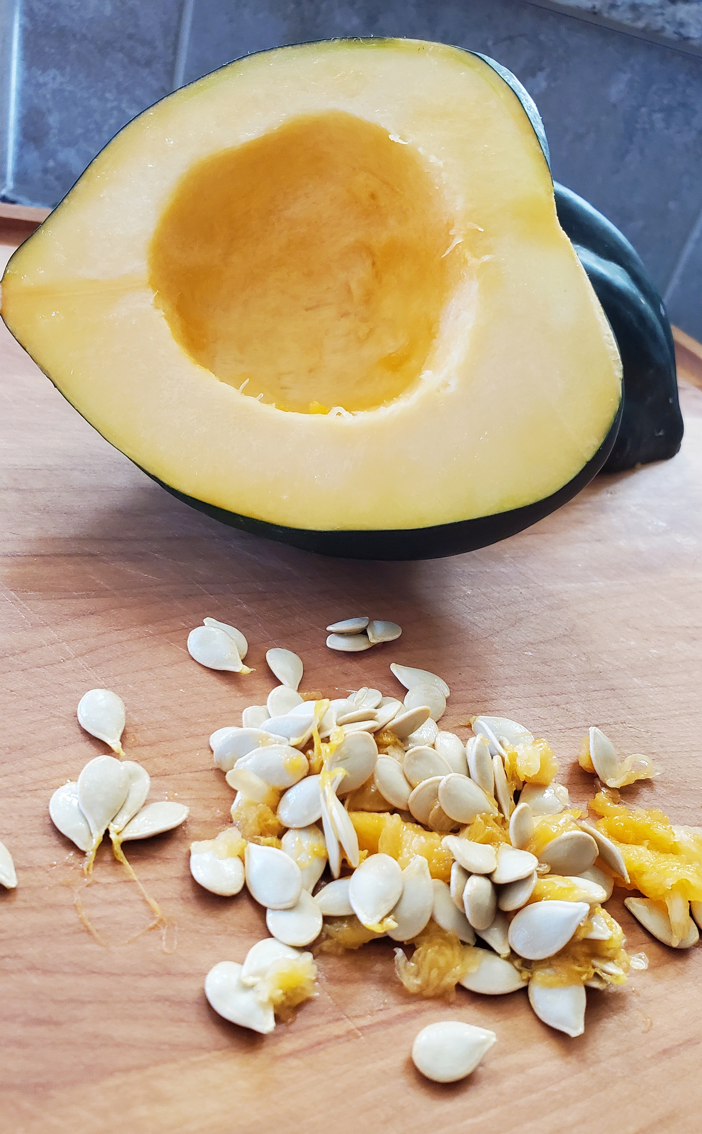 Using a sharp knife, cut the acorn squash in half vertically. Spoon out the seeds and stringy flesh in the center. (You can clean and roast these seeds for snacking, if you wish!)
