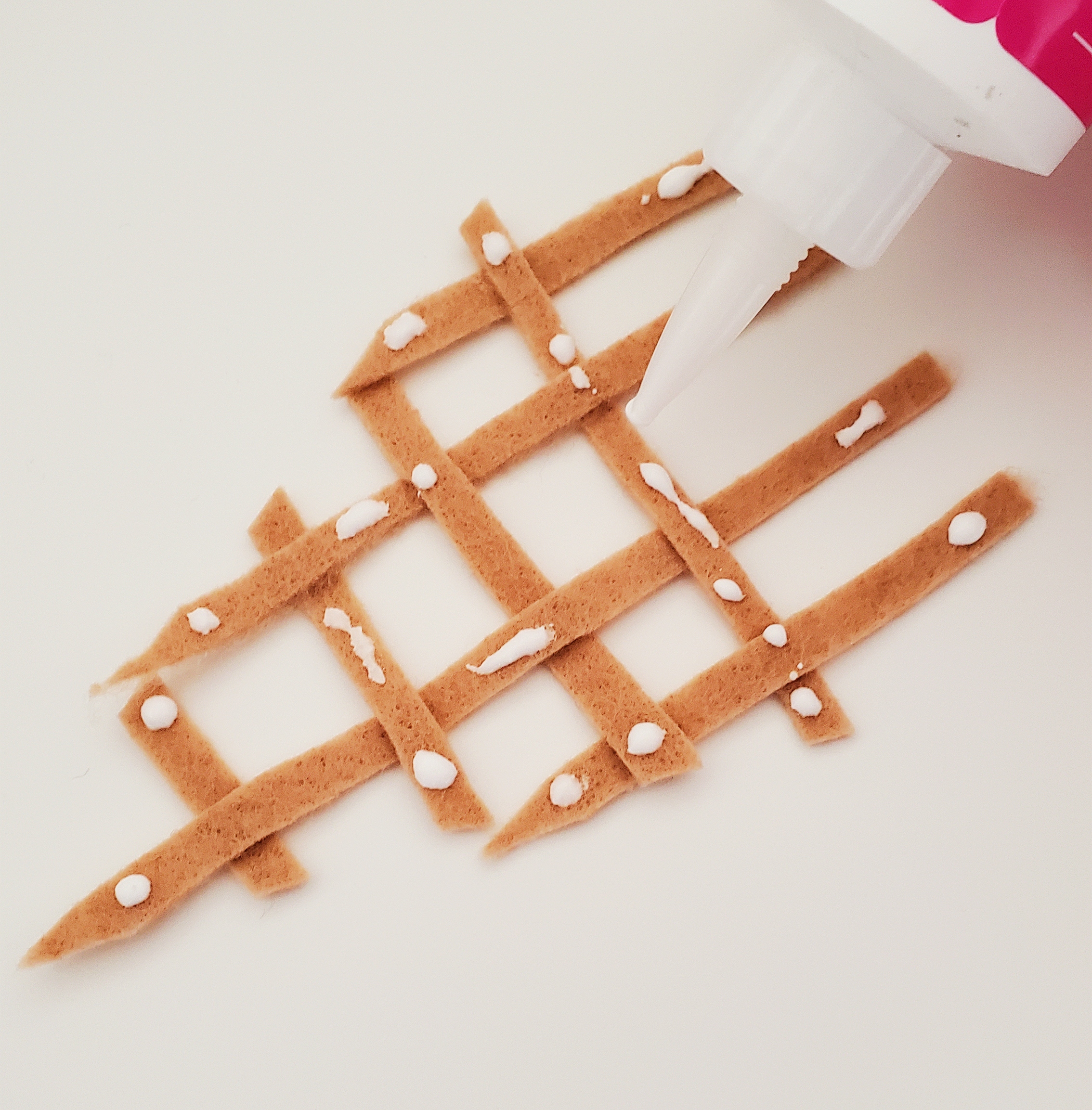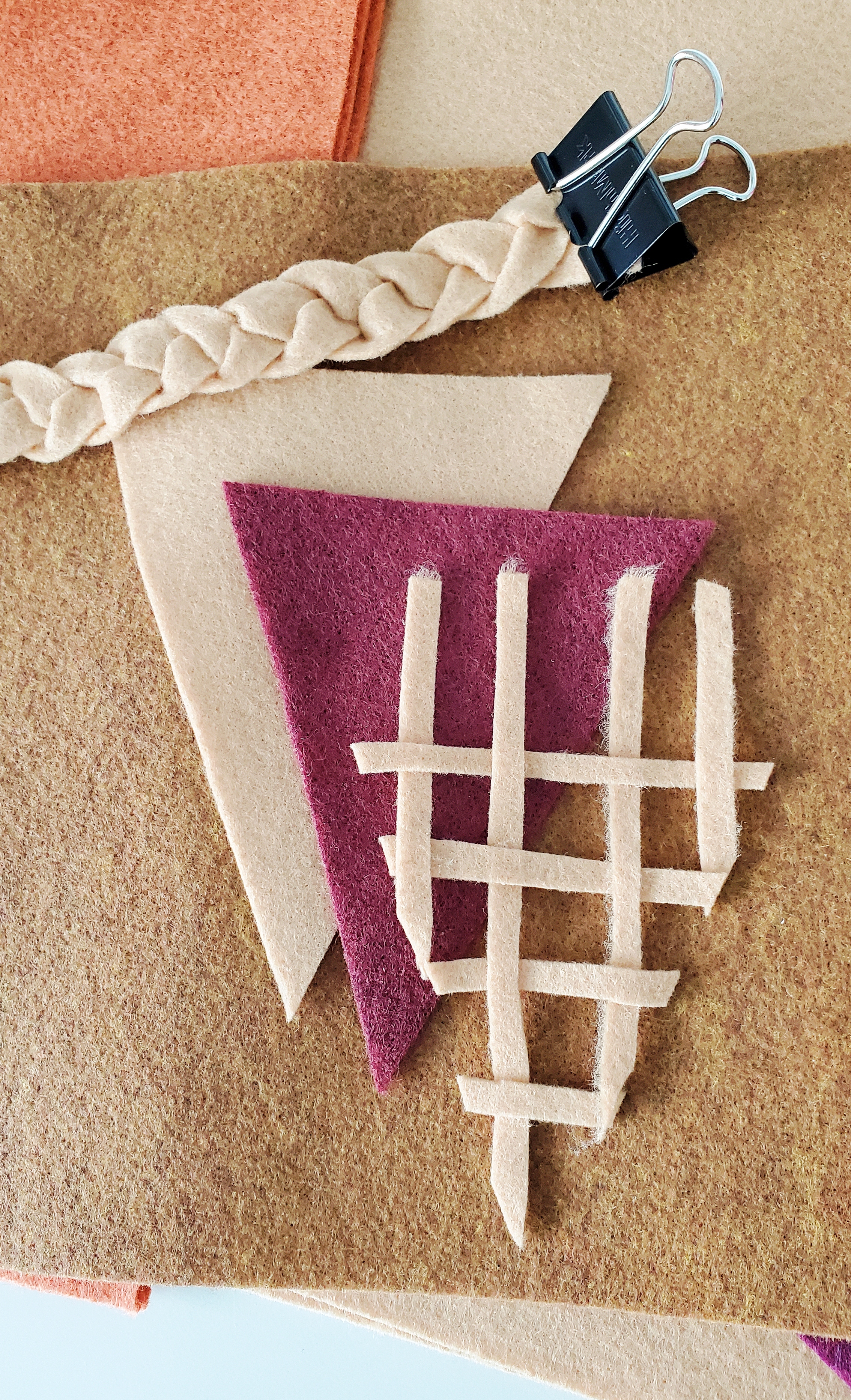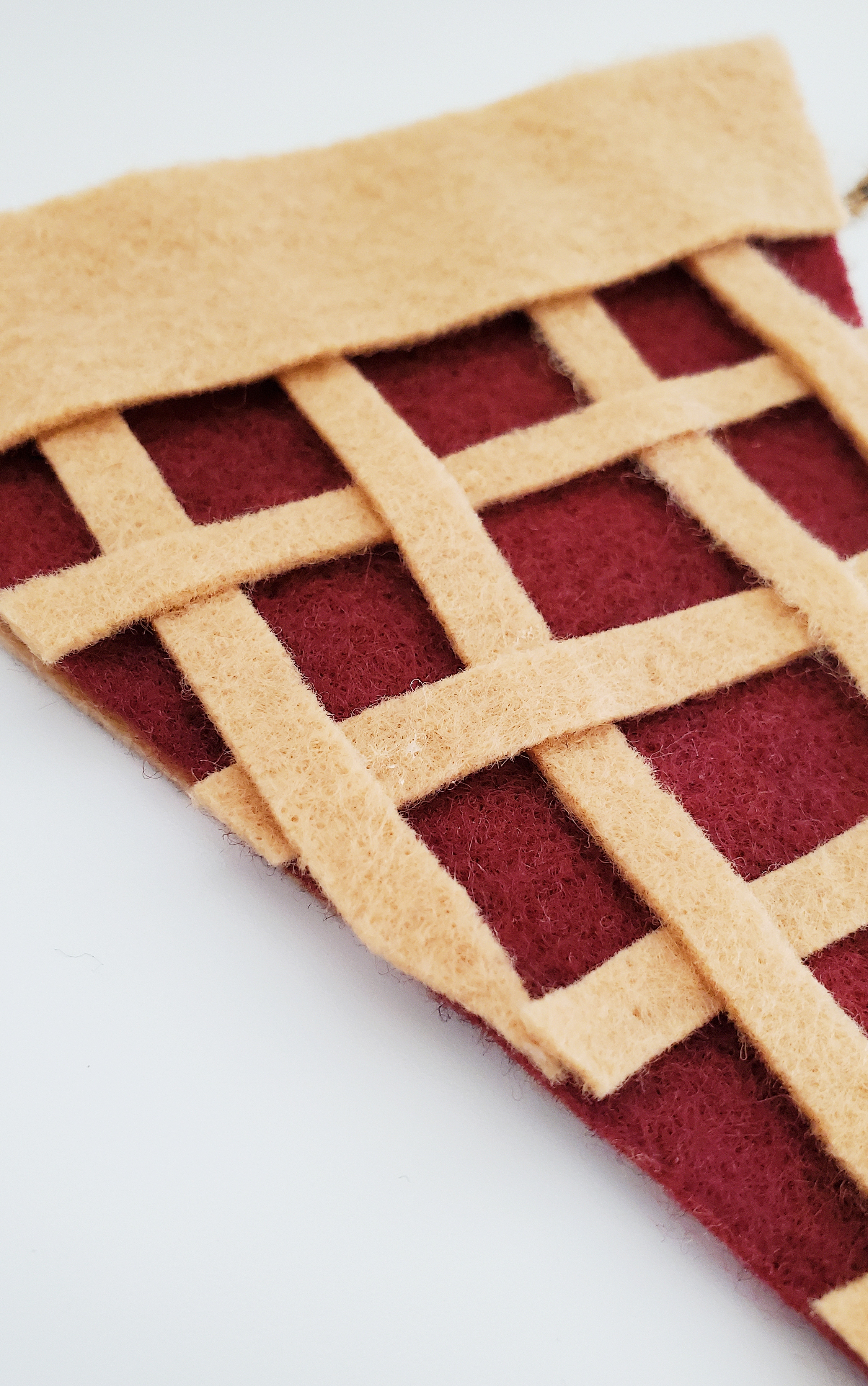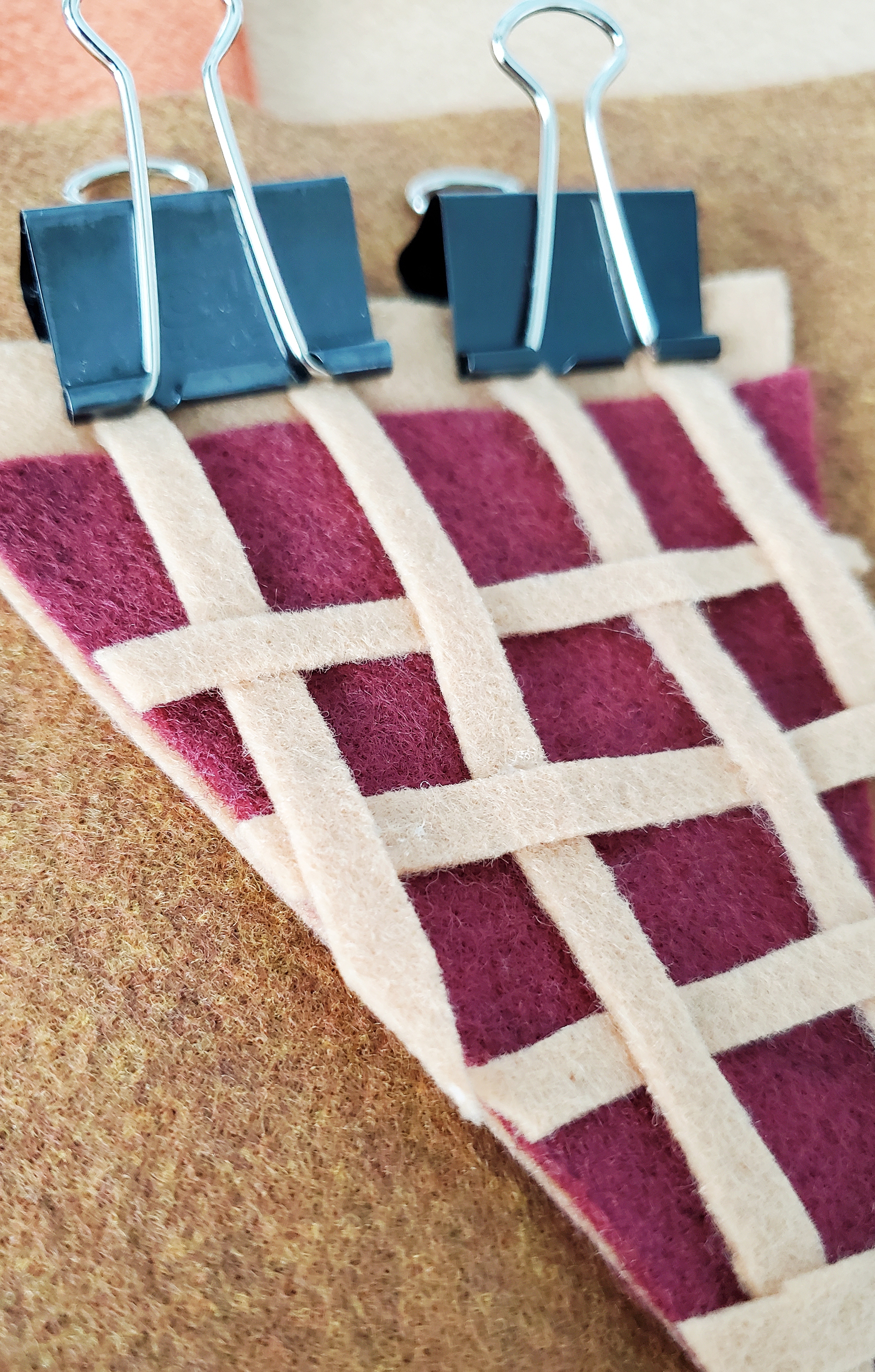 Cut 8 thin strips of the same color felt as your crust. Clip four of them to the top of the pie piece spaced evenly apart. Weave the remaining 4 strips horizontally in a standard lattice pattern. (see photo) Glue all pieces together at every joint. Once dry, trim the lattice top to the same size as the pie slice.