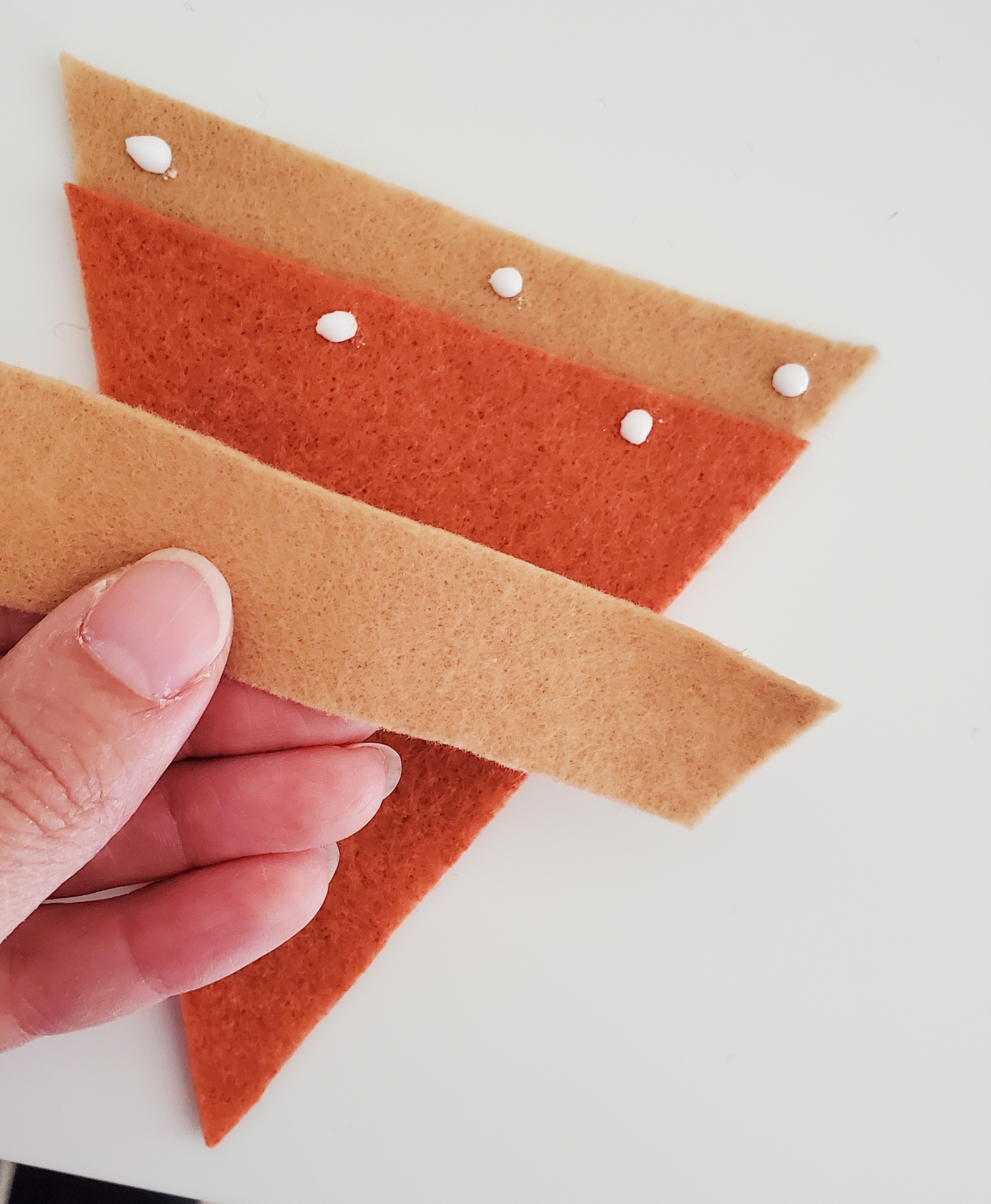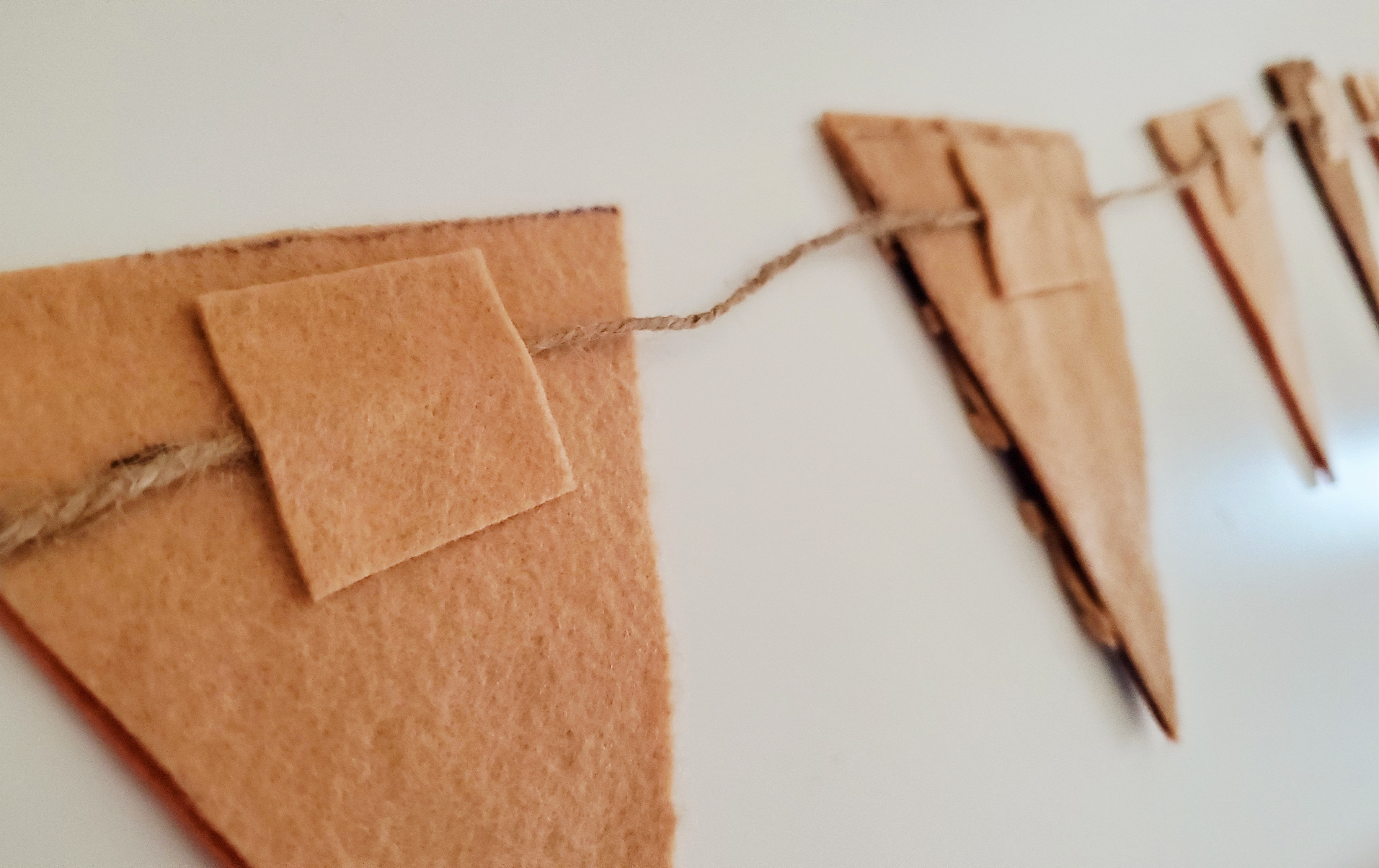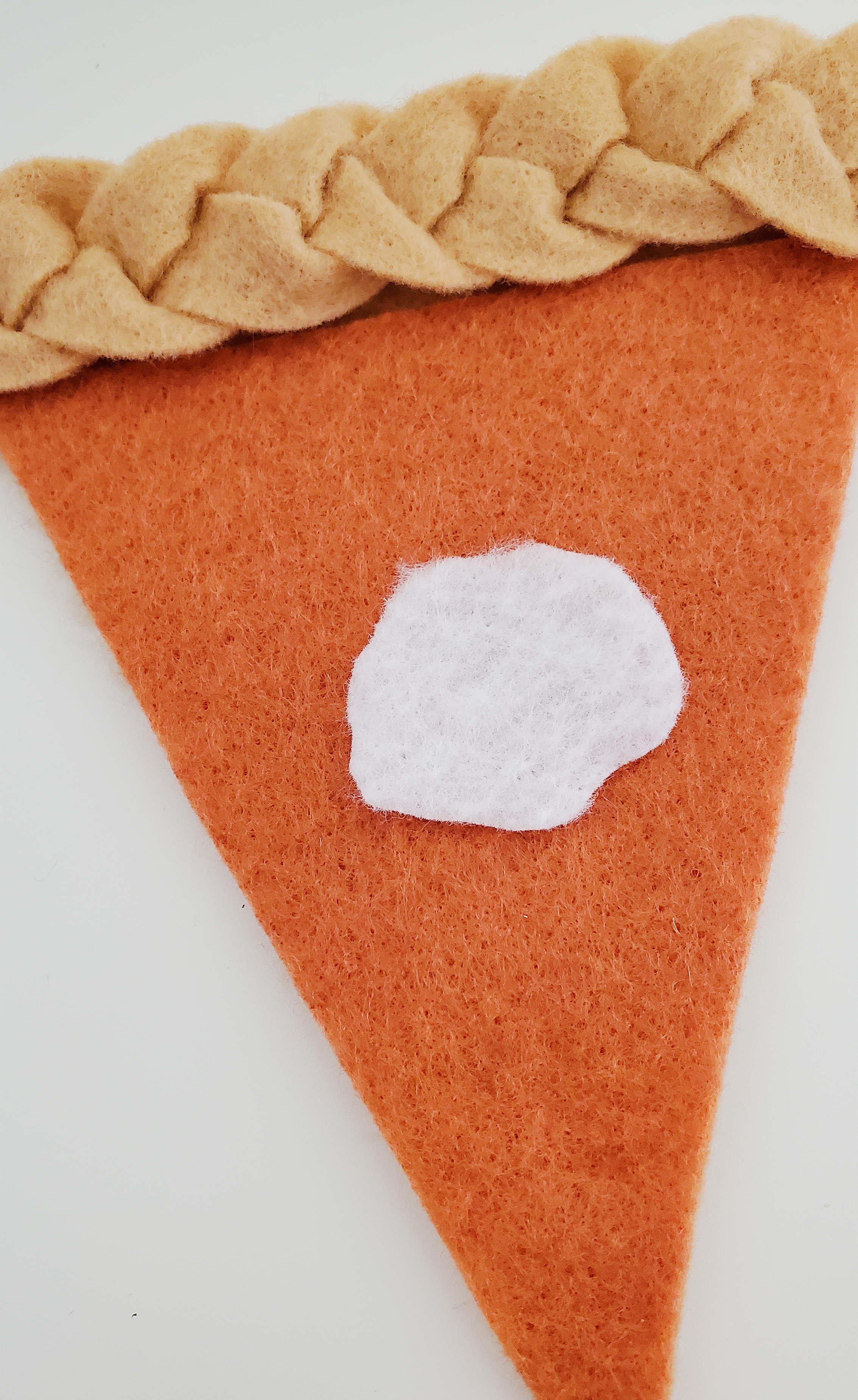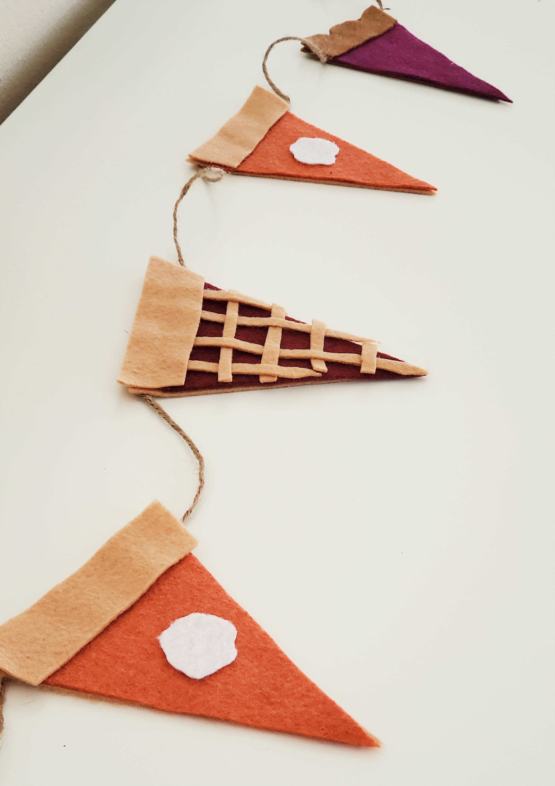 To assemble your garland, glue the twine to the back of each piece of pie. Then, secure it by gluing a square of felt over the twine. (see photos below)