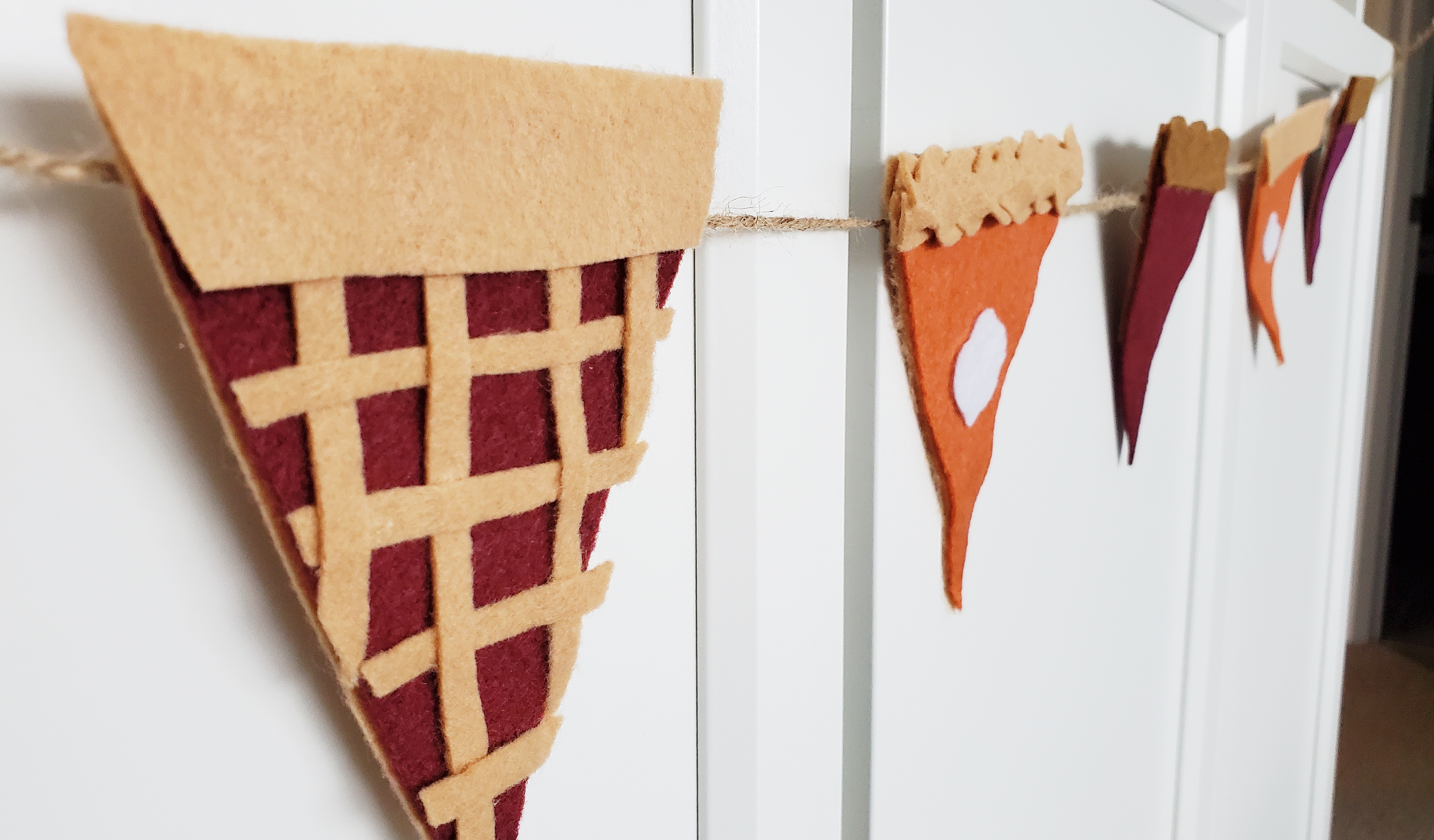 Most online pie garland tutorials are relatively simple, sticking with basic pumpkin pie. However, the rainbow of colored felt pieces available at the craft store inspired me to incorporate more types of pie and thereby more fall colors. I grabbed some violet for berry, some maroon for apple, and orange for pumpkin, of course!
