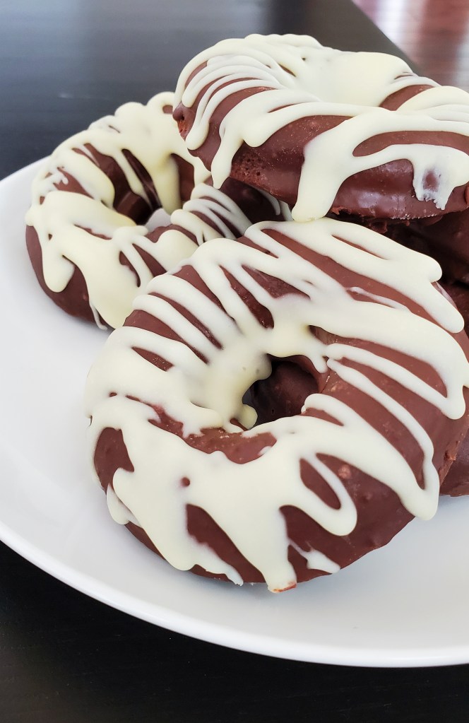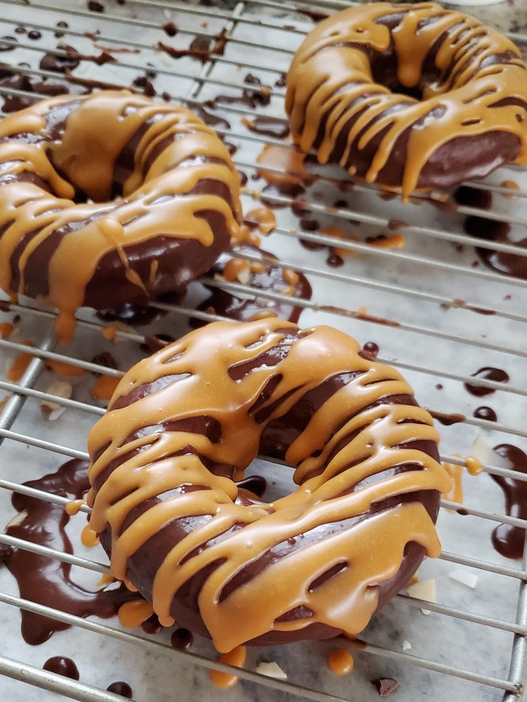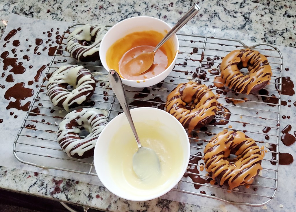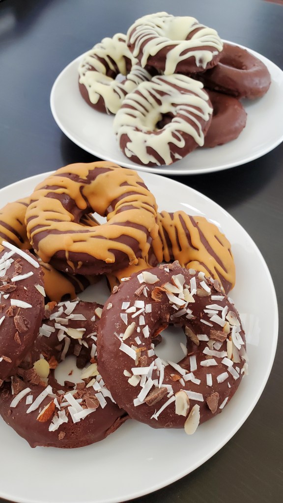First, I added espresso powder to the base batter, turning these into mocha donuts, not just chocolate donuts. Then, I added various toppings and drizzles to transform them into three alternative flavors: Almond Joy©, Pumpkin Spice Mocha (for fall), and Peppermint Mocha (for Christmas).