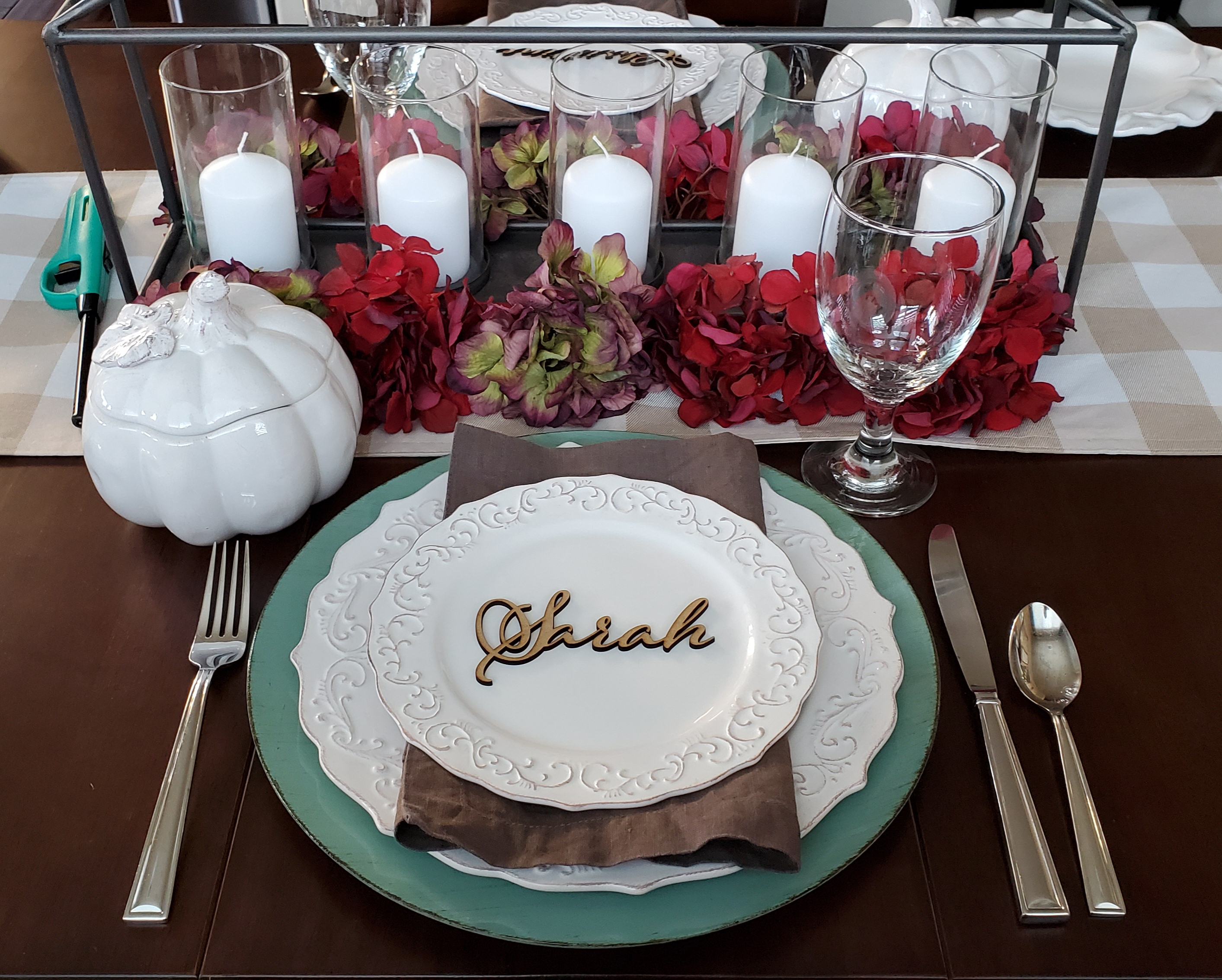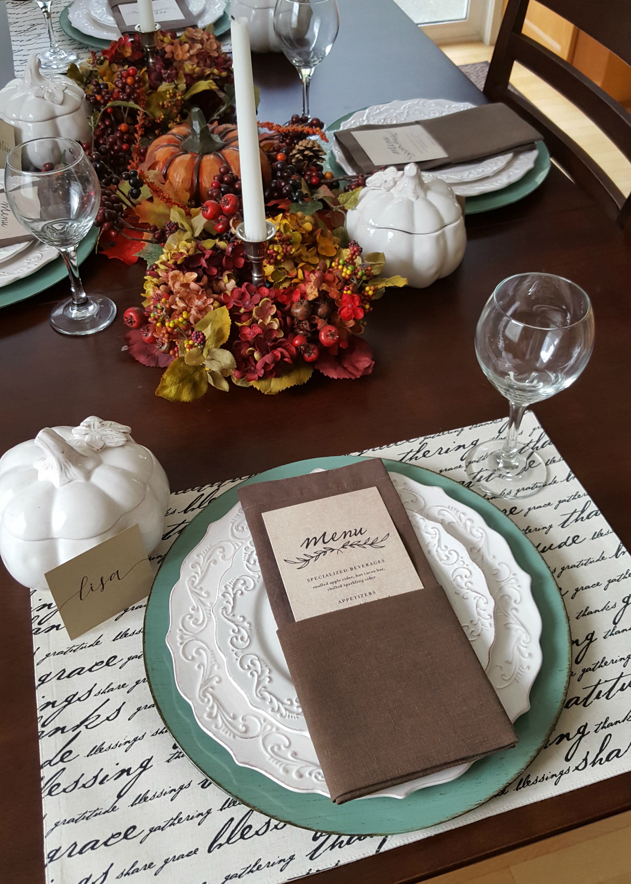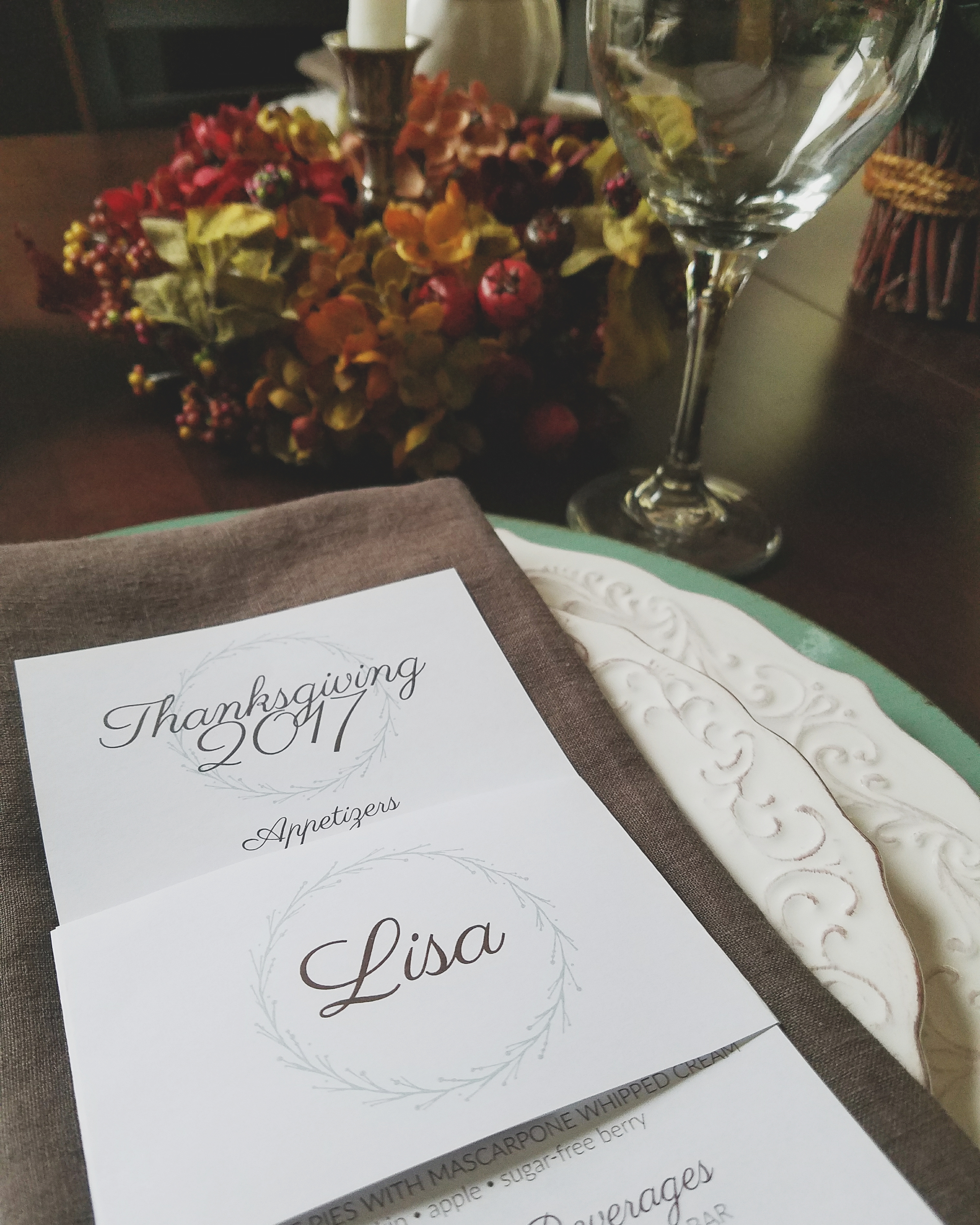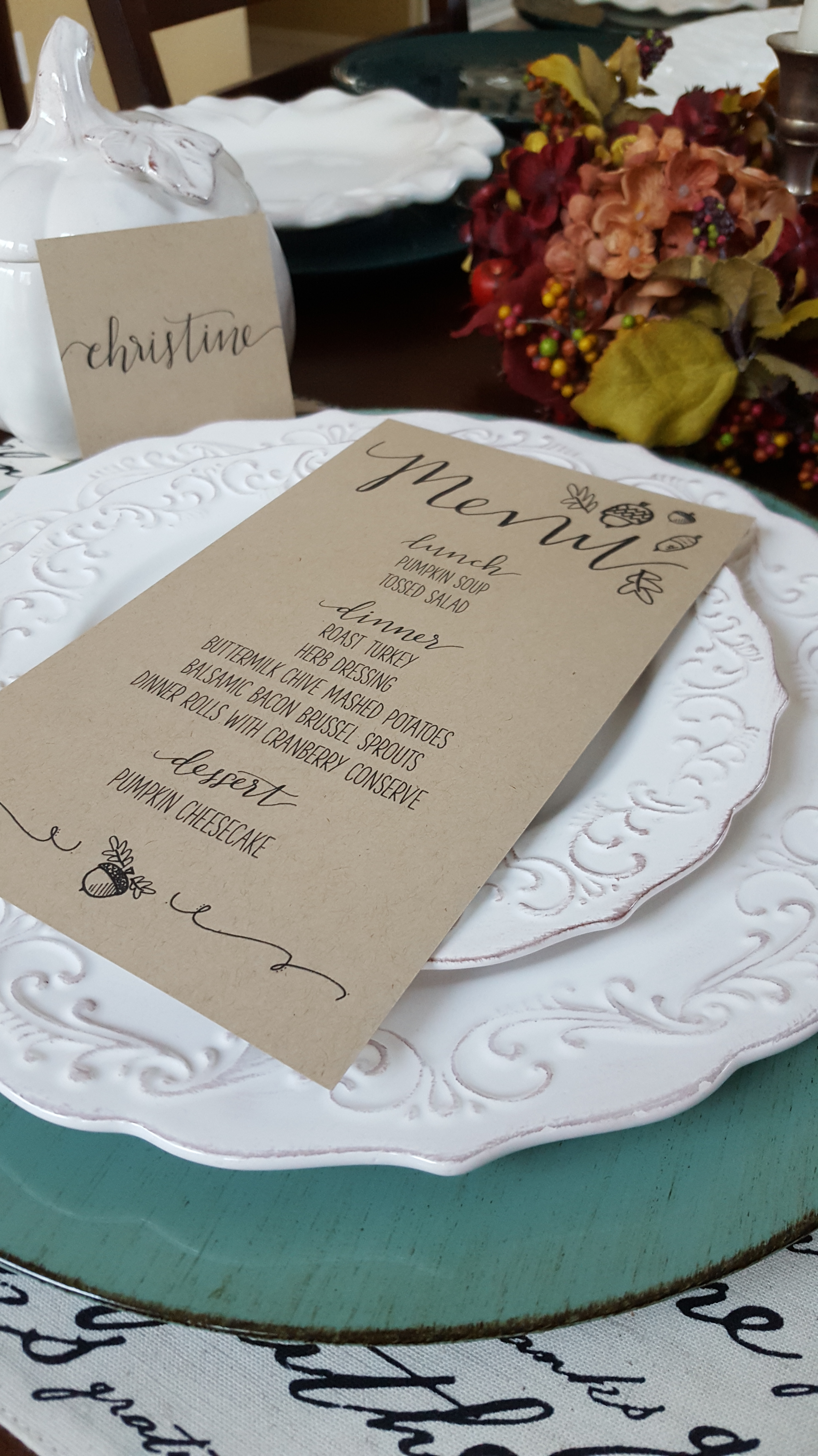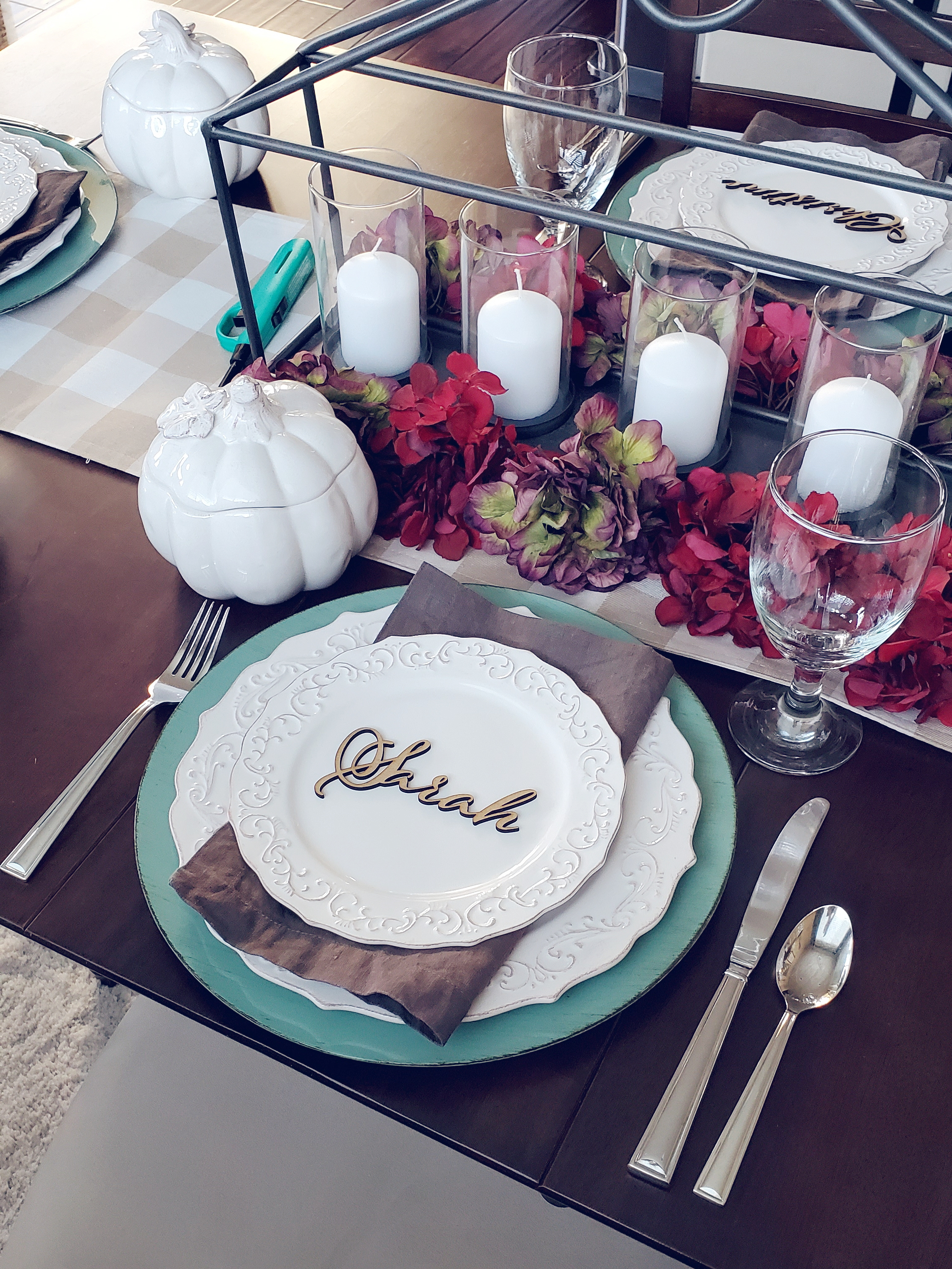 If you own your own printer, you can use design programs to create your own menus and place cards. If you’re unable to use major programs like the Adobe Suite, try online options like PicMonkey or Canva. You can also use online print shops like Tiny Prints or Minted to design your own. If you have the extra funds, you can order them to be hand lettered by an artist on sites like Etsy. One of my favorite Thanksgiving table elements are our names laser-cut out of wood.