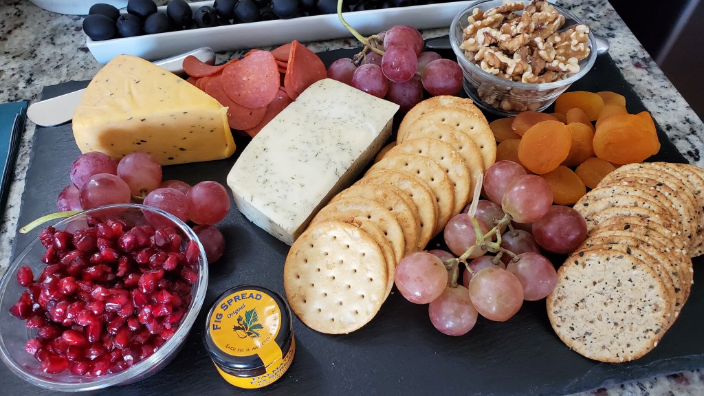 I always set cheeses out first. They are the stars, after all! Spread them out evenly across your board, and make sure to leave room for people to cut chunks off. Once those are placed, add anything you’re using a bowl to serve, like nuts or spreads. Fill in the remainder of the board with the largest items first. Once those are down, fill in the gaps with the smaller items. And remember, there are no rules in building a grazing board! Just lay things as you find them attractive!