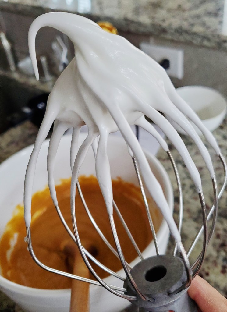 In a large bowl, whisk 1-1/2 cups canned pumpkin purée with1 cup (8 ounces) sour cream, ¾ cup sugar, ½ teaspoon kosher salt, 1-1/2 teaspoons cinnamon, 1 teaspoon ground ginger, ½ teaspoon ground nutmeg and ¼ teaspoon ground cloves. Separate the 3 large egg yolks & whites. Stir the egg YOLKS into the pumpkin mix. Set aside.