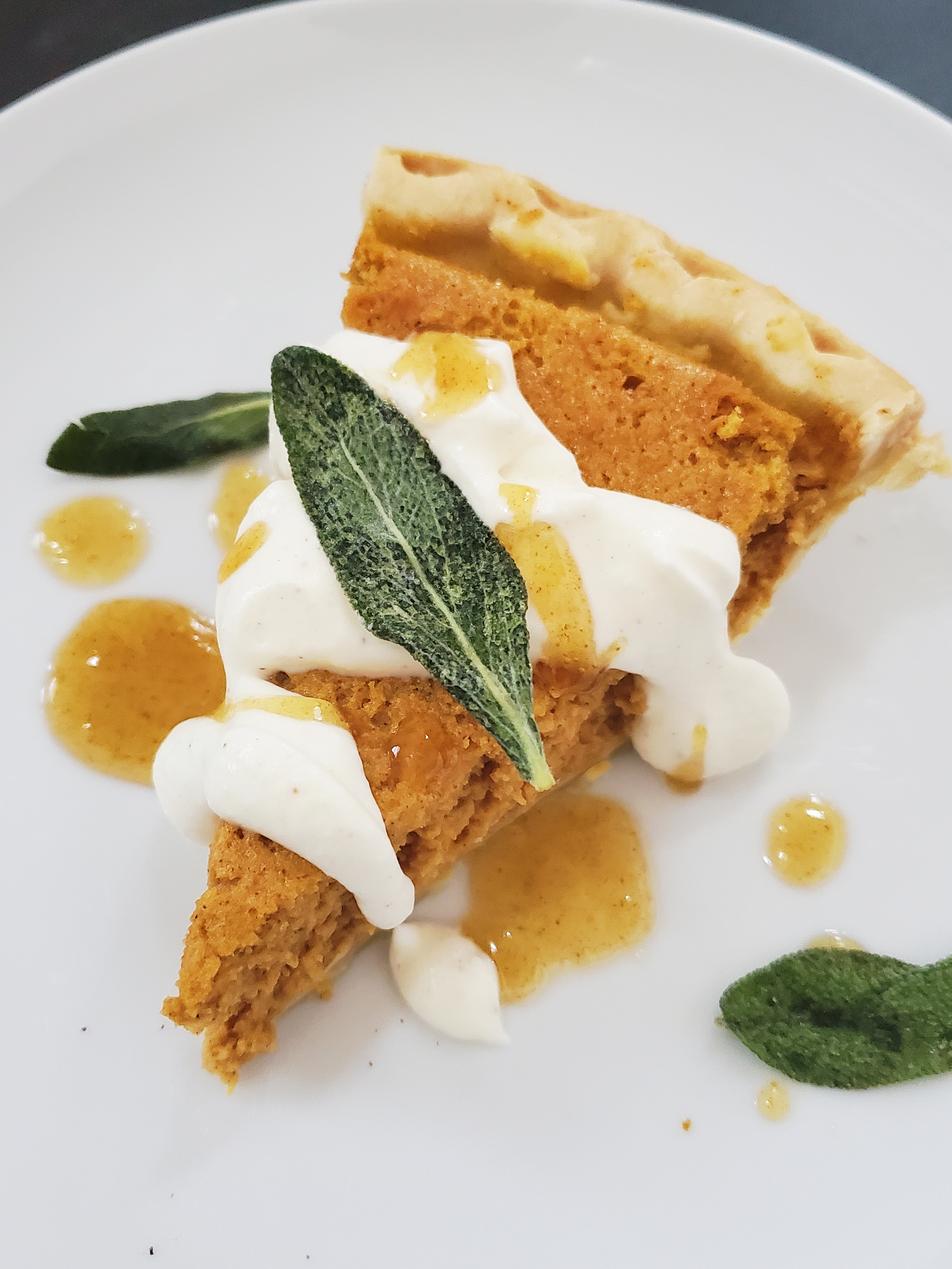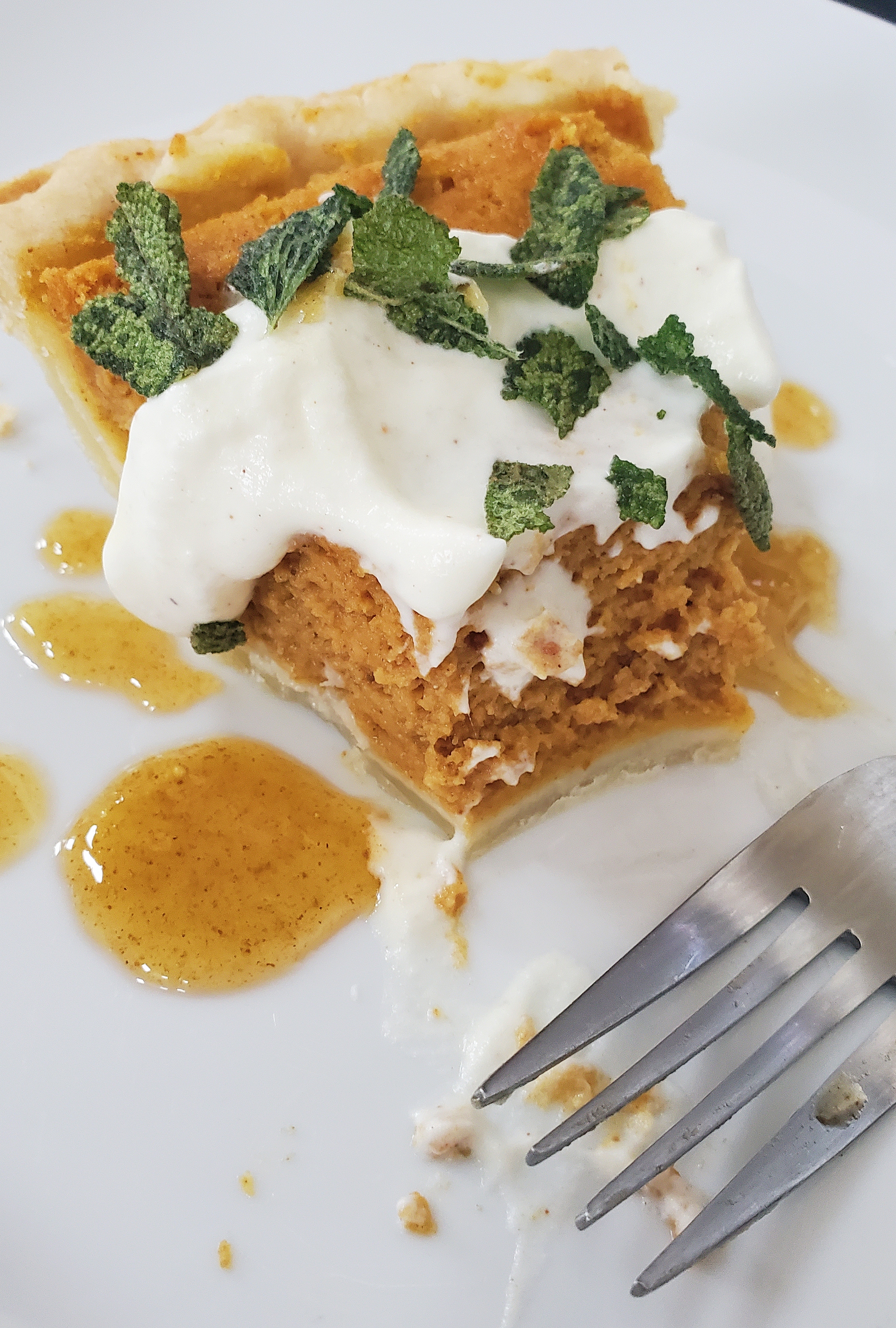 But we’re not done yet, and this is the best part! Based on a Tyler Florence recipe, this pie is then topped with whipped egg nog, honey butter drizzle, and crunchy, fried sage leaves.