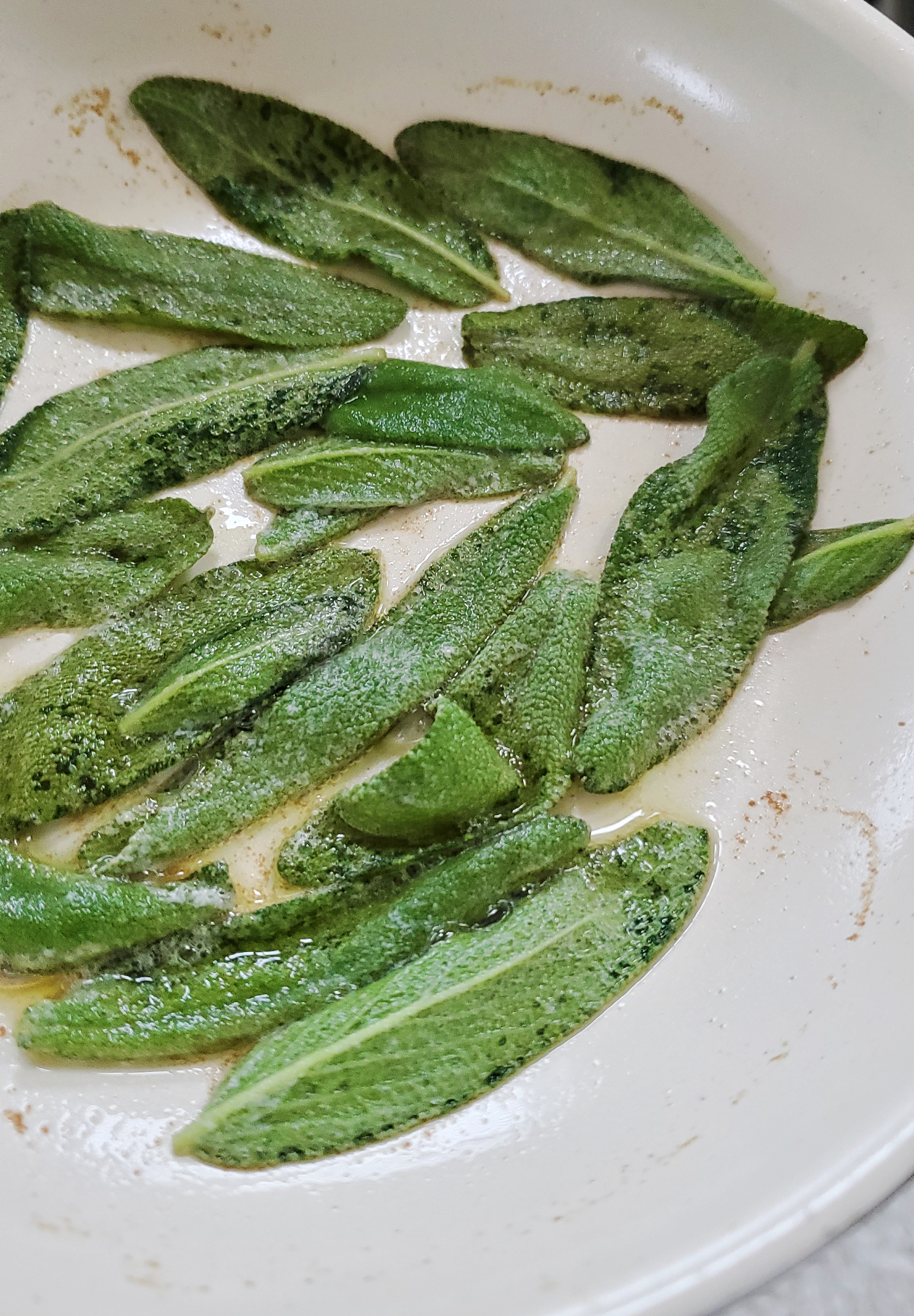 In a small skillet, heat butter until bubbling. Once hot, lay the sage leaves in the hot butter and let them fry for 1-2 minutes. Remove the leaves from the butter and allow them to drain on a paper towel.