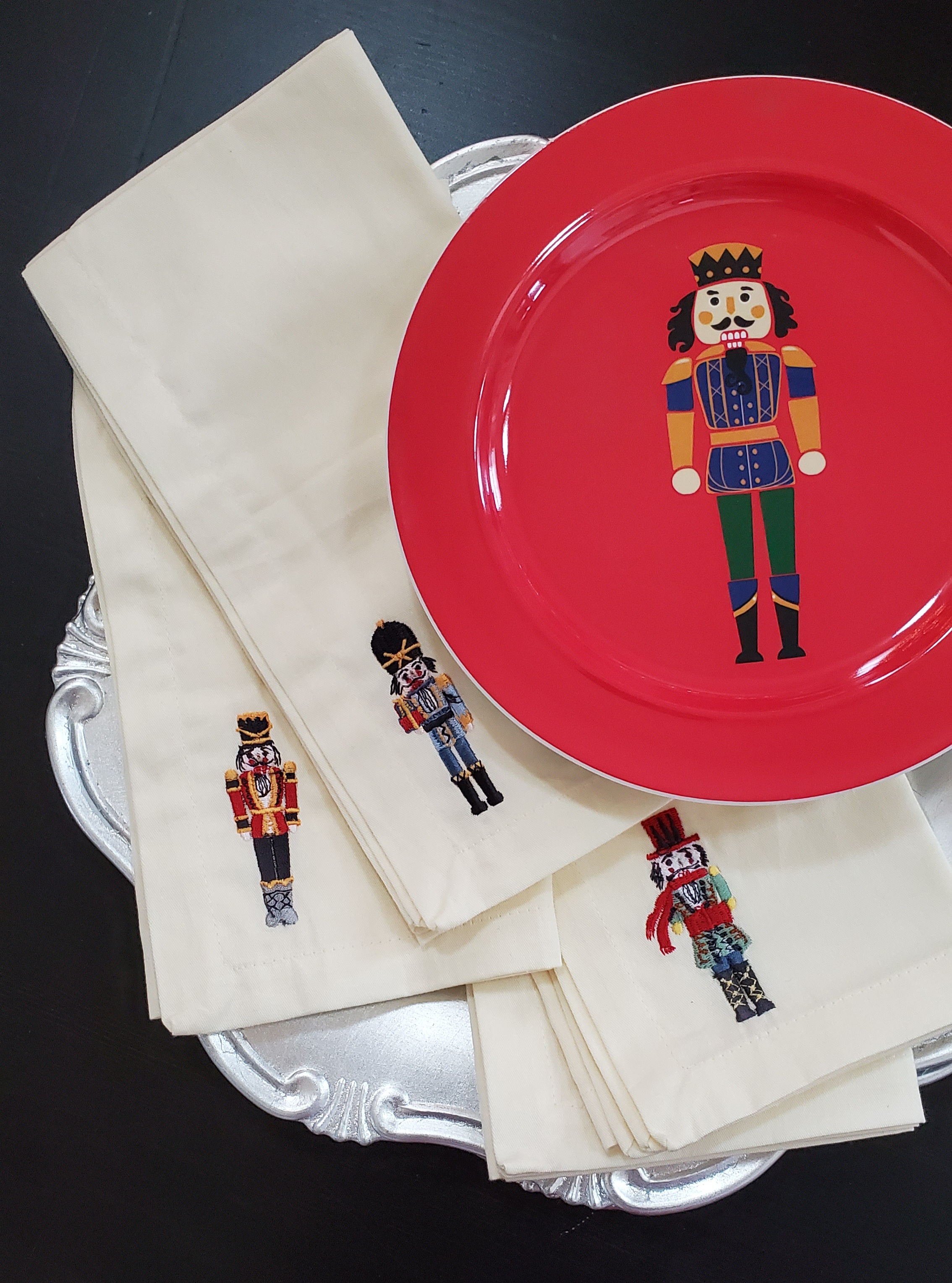 Also, don’t be afraid to pull in similar pieces from other collections for interest. For more casual December meals, I love using my set of melamine nutcracker plates from FAO Schwartz and matching embroidered nutcracker napkins from Cost Plus World Market, against the backdrop of my formal linens.