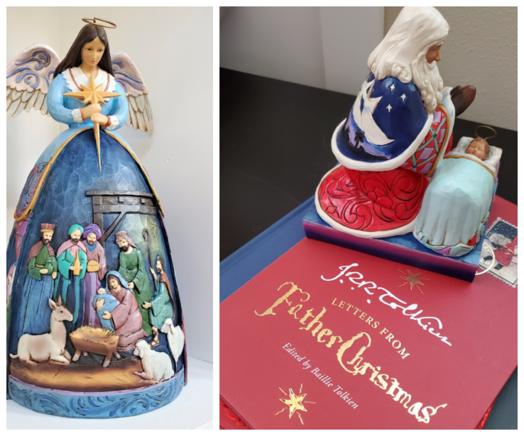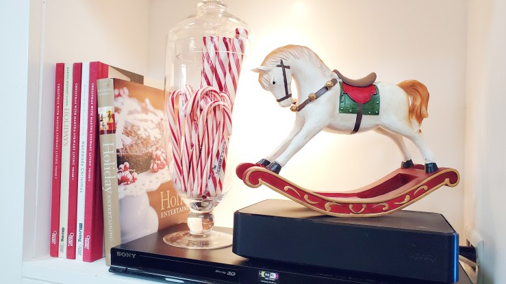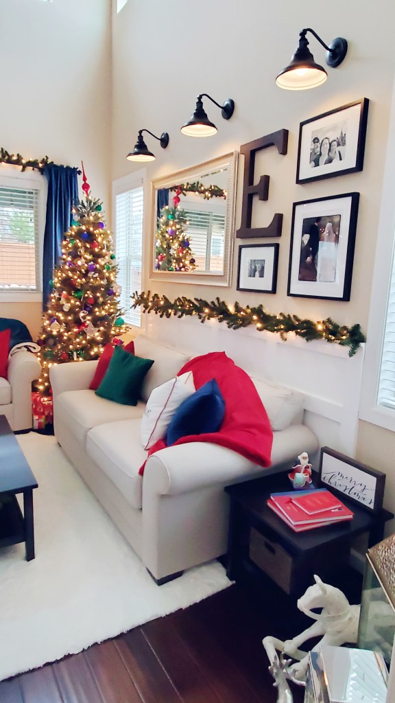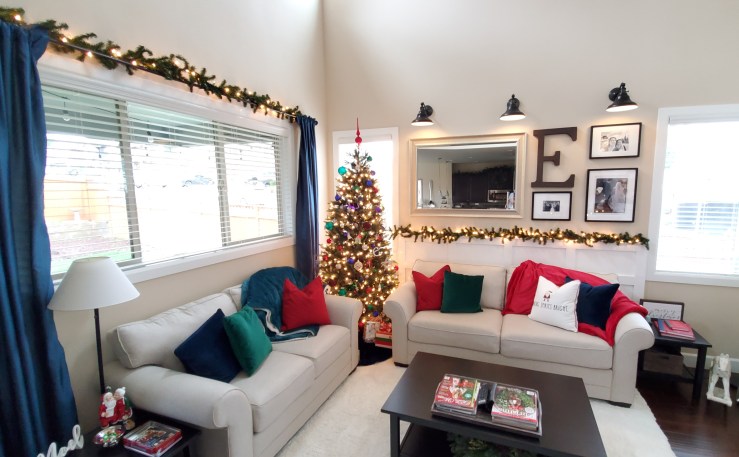 This room is a lot more playful than the dining room, pulling in a lot more jewel tones. This wider spectrum of colors pop right off our usually neutral living room, especially when they’re glitter and sparkly! I also really Jim Shore’s style and have begun collecting some of his colorful Christmas pieces, as well. Our tree is artificial, but there’s a real wreath tucked into the lower level of the coffee table that fills the entire room with that fresh pine scent. We prefer that to any synthetic Christmas tree smells out there!