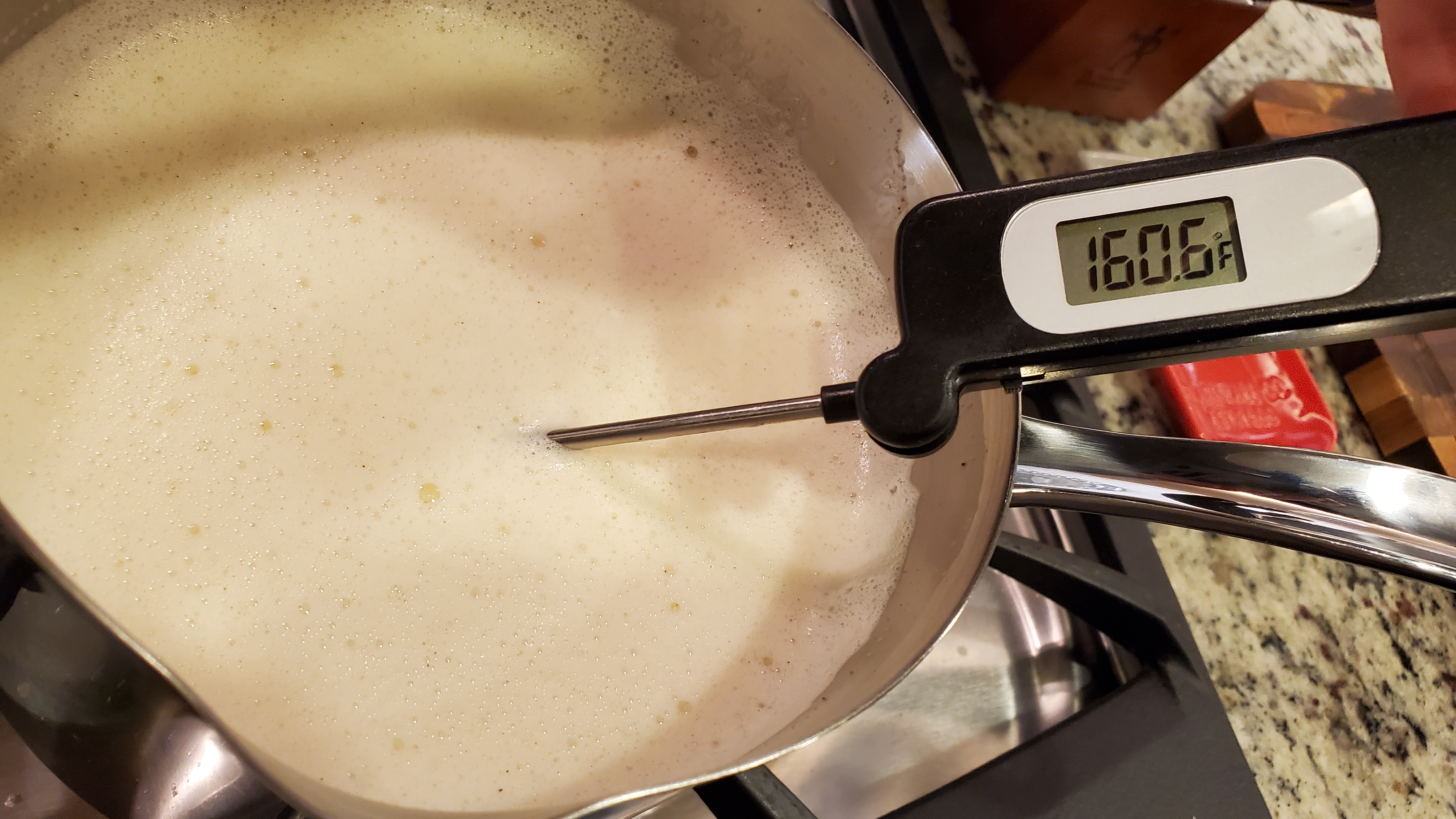 Add a big spoonful of the hot milk mixture to the egg mixture, whisking vigorously. Repeat, adding a big spoonful at a time, to temper the eggs. Once most of the hot milk has been added to the eggs, pour the mixture back into the saucepan on the stove. Whisk constantly for just a few minutes, until the mixture reaches 160F on a thermometer.