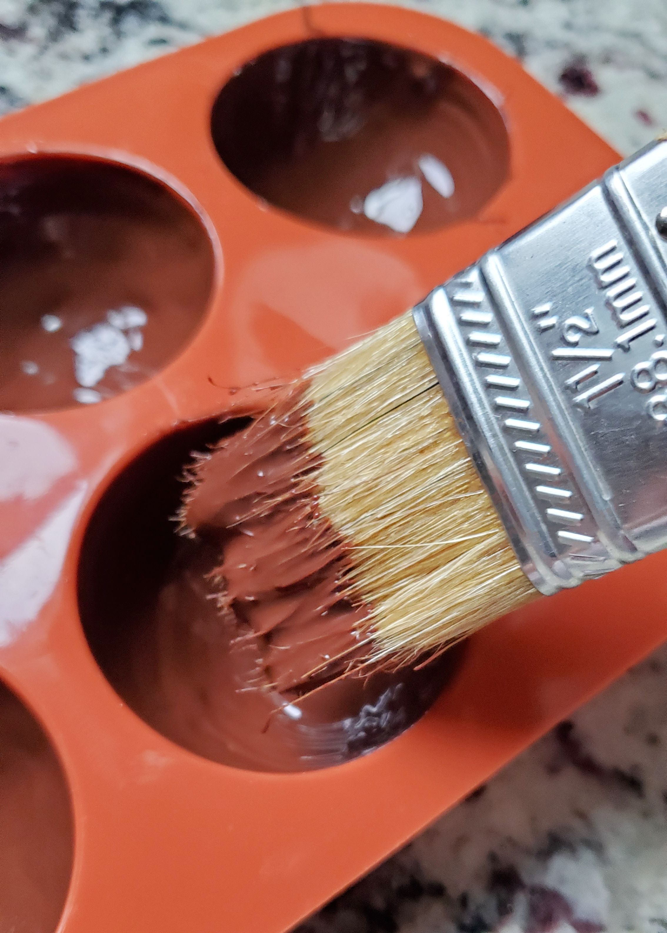 Make sure your molds are clean by polishing them with a paper towel. Using a pastry brush, paint a thin layer of chocolate into the molds and refrigerate for 5 minutes. Paint a second coat of chocolate over the first, just like the previous layer. Refrigerate for 5 minutes. Finally, paint a third coat just like the last two, paying special attention to building up the rim of the sphere. Refrigerate for 5 minutes.