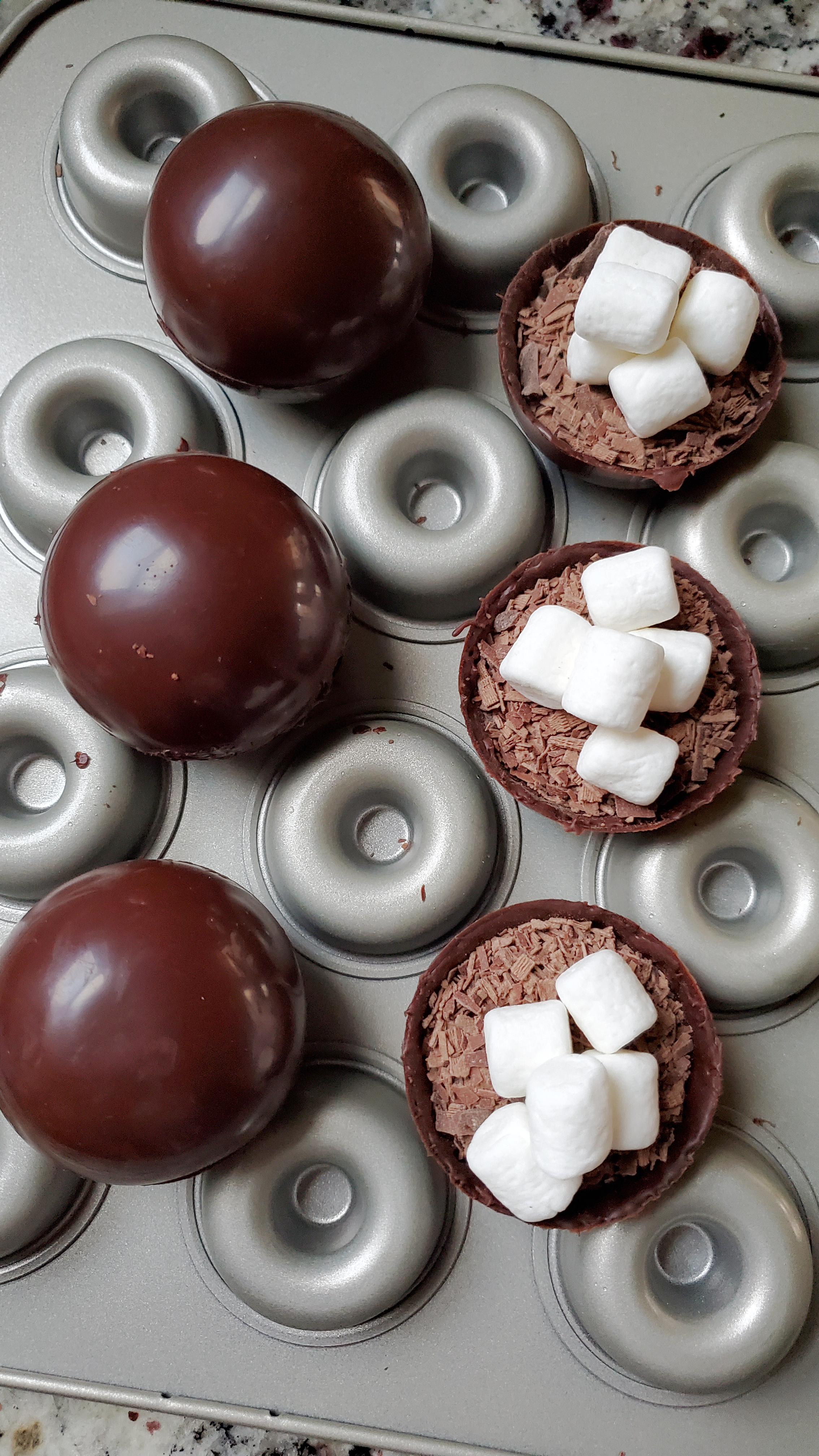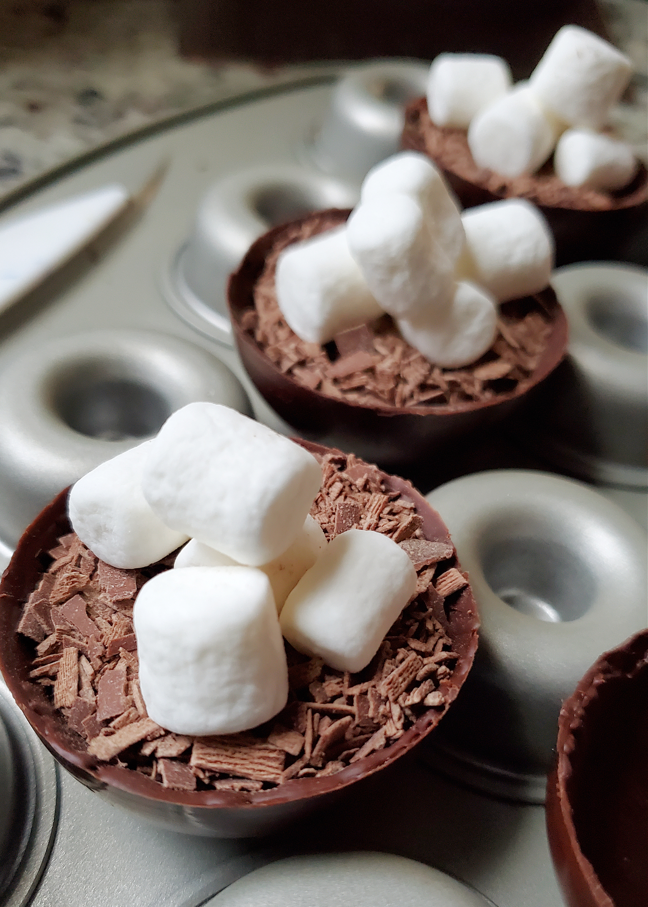 Carefully take your chocolate out of the molds; fill with 1-2 tablespoons of hot cocoa mix and 4-5 marshmallows.