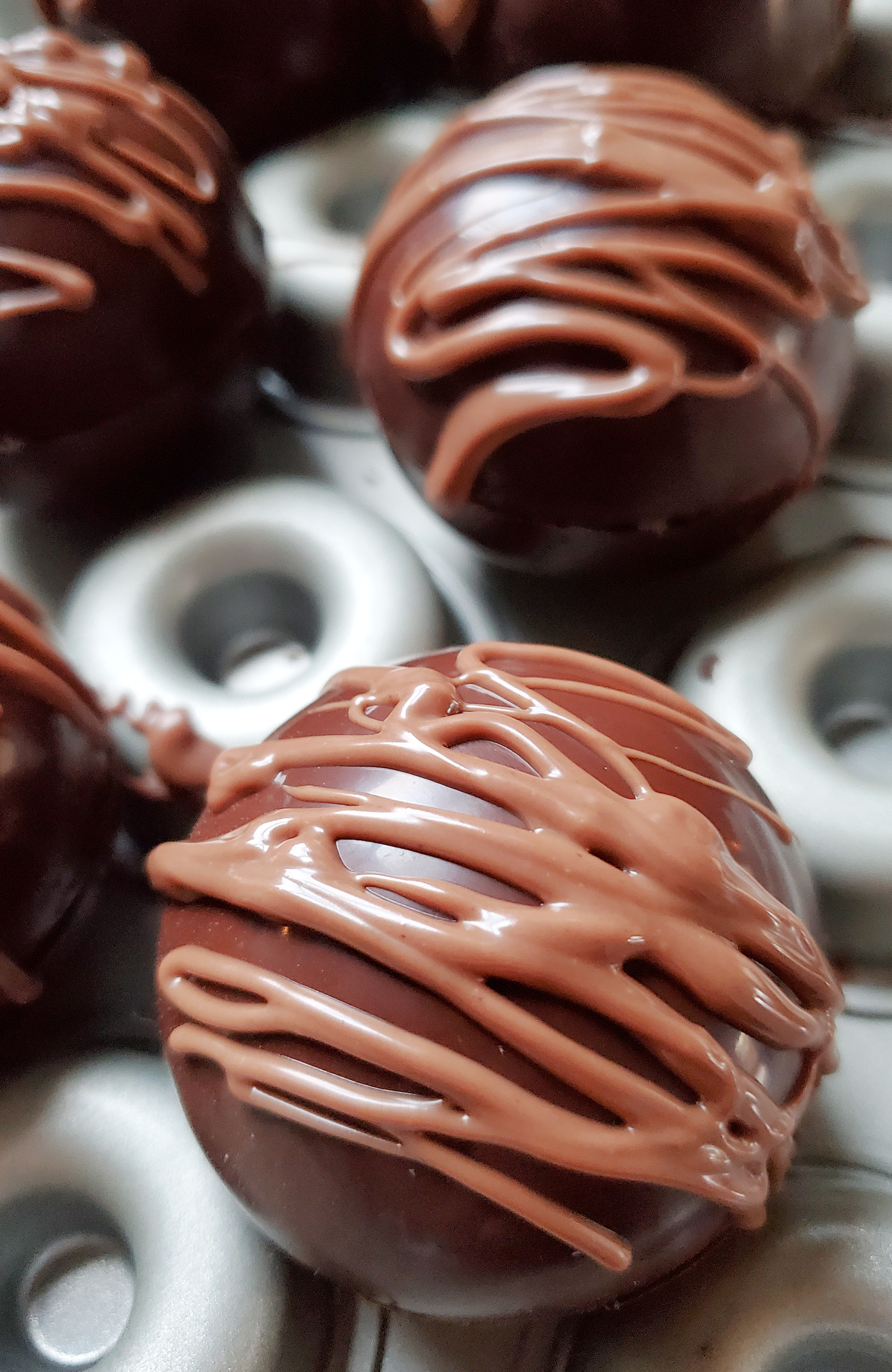 Melt the white/blonde chocolate chips the same way you melted the milk chocolate. (We used the same bowl as the milk chocolate. This is just meant to be decorative, so it’s okay if the chocolates mix.) Once melted, drizzle it over the top of each sphere using a fork.