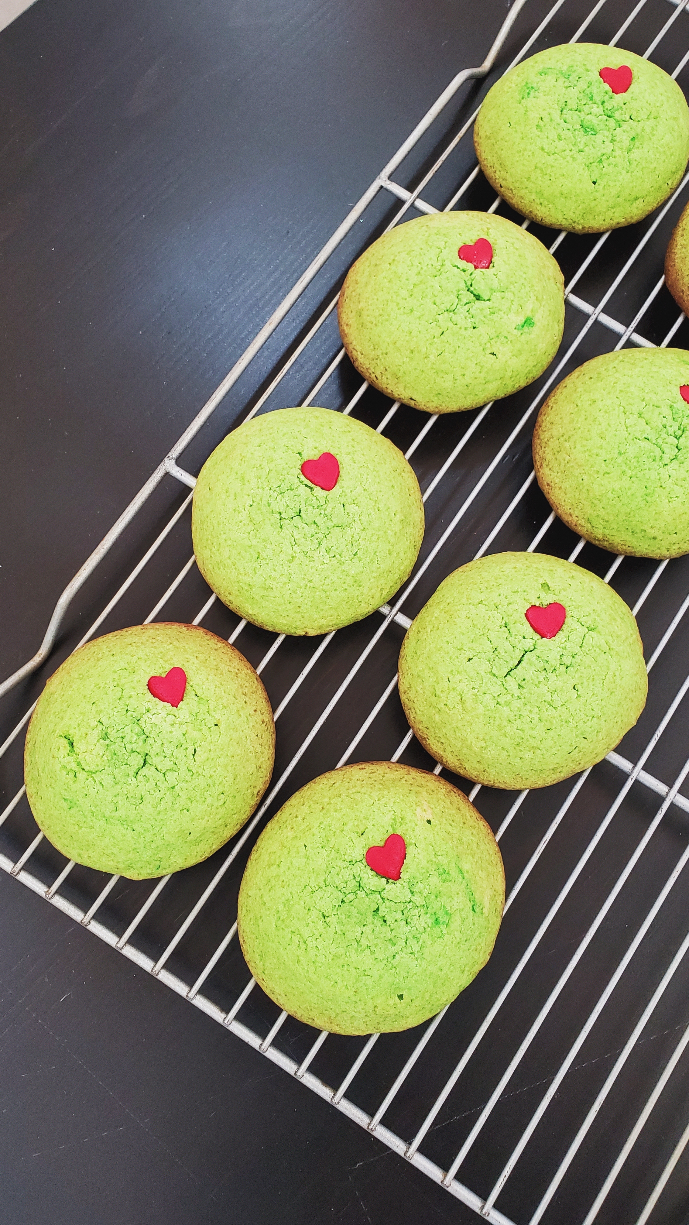 So imagine my pure holiday glee when I saw these adorable sugar cookies, dyed Grinch green, with a perfect little red heart pressed into each one. I knew I had to make them!