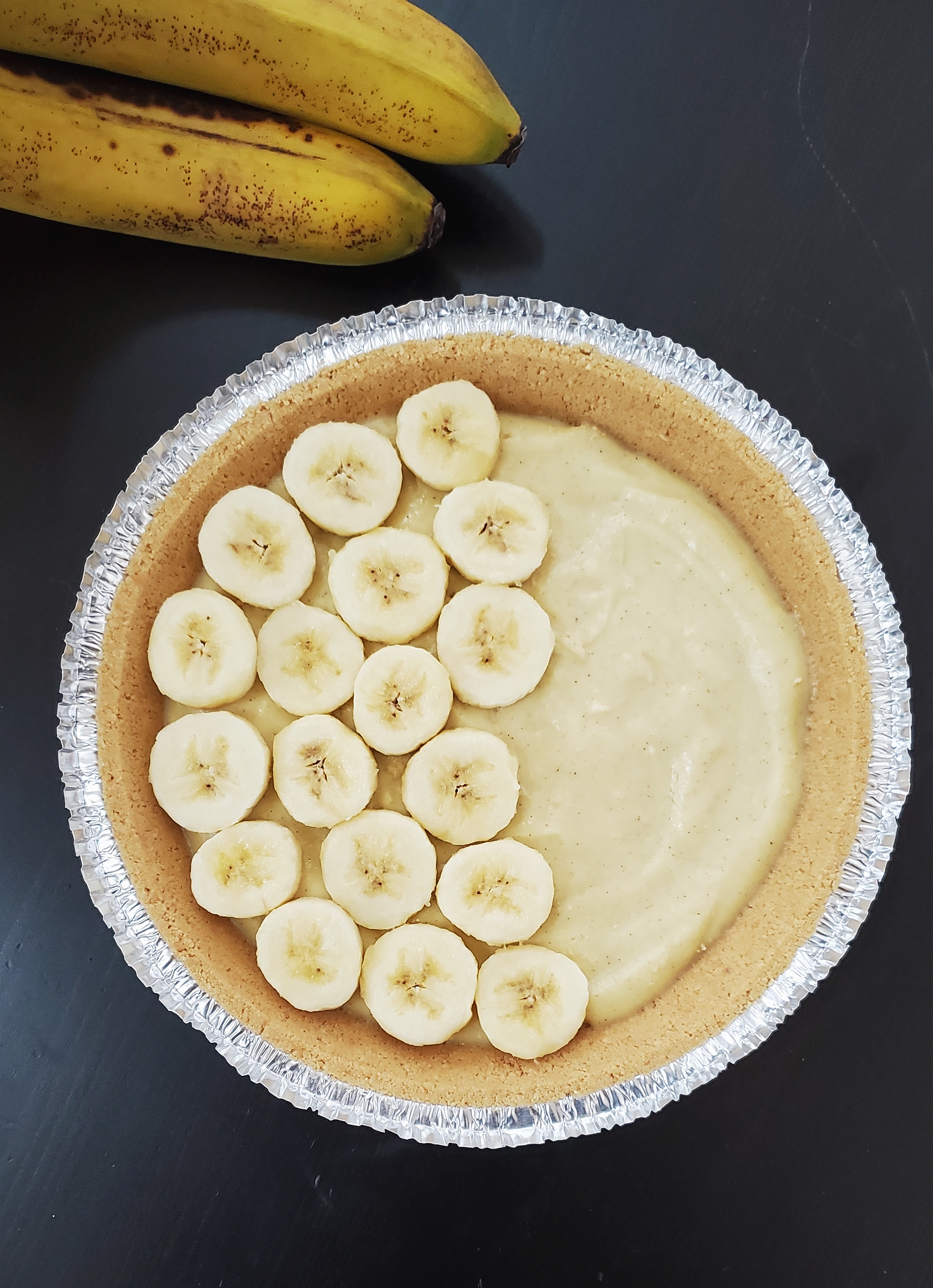 Instead of the single custard filling from the Pinterest photo, our version has three layers: a vanilla crème pâtissière (pastry cream) on the bottom, a layer of sliced fresh (ripe) bananas, and the most delectable peanut butter-cream cheese deliciousness you’ve ever tasted! (Seriously, it’s phenomenal!) Finally, to top my celebration pie, I chose a simple whipped cream and garnished with banana chips.