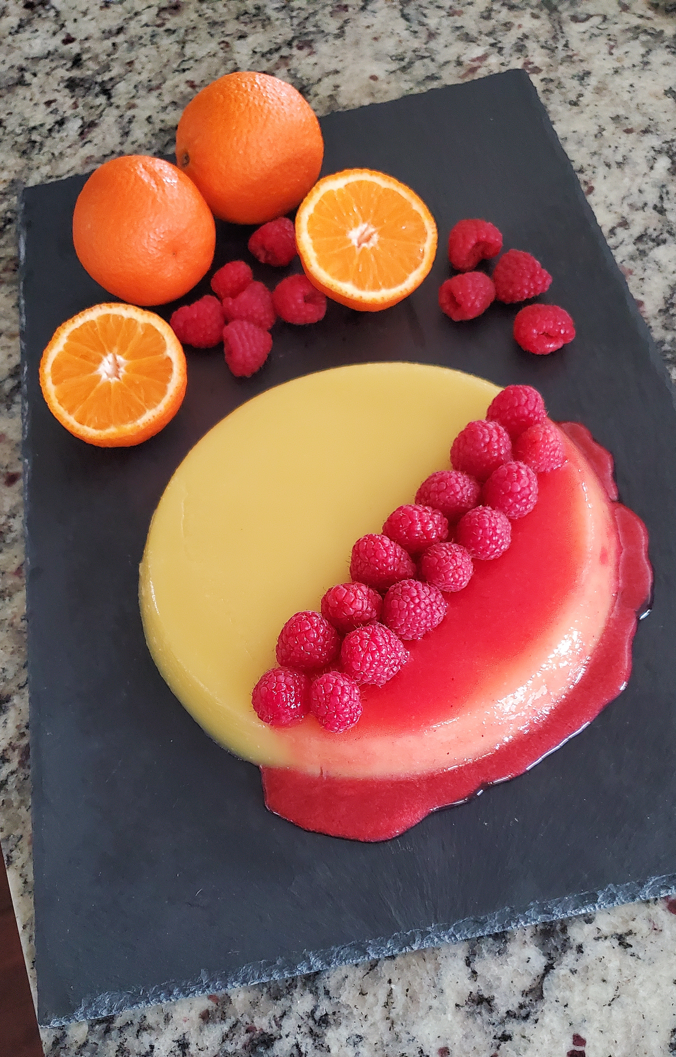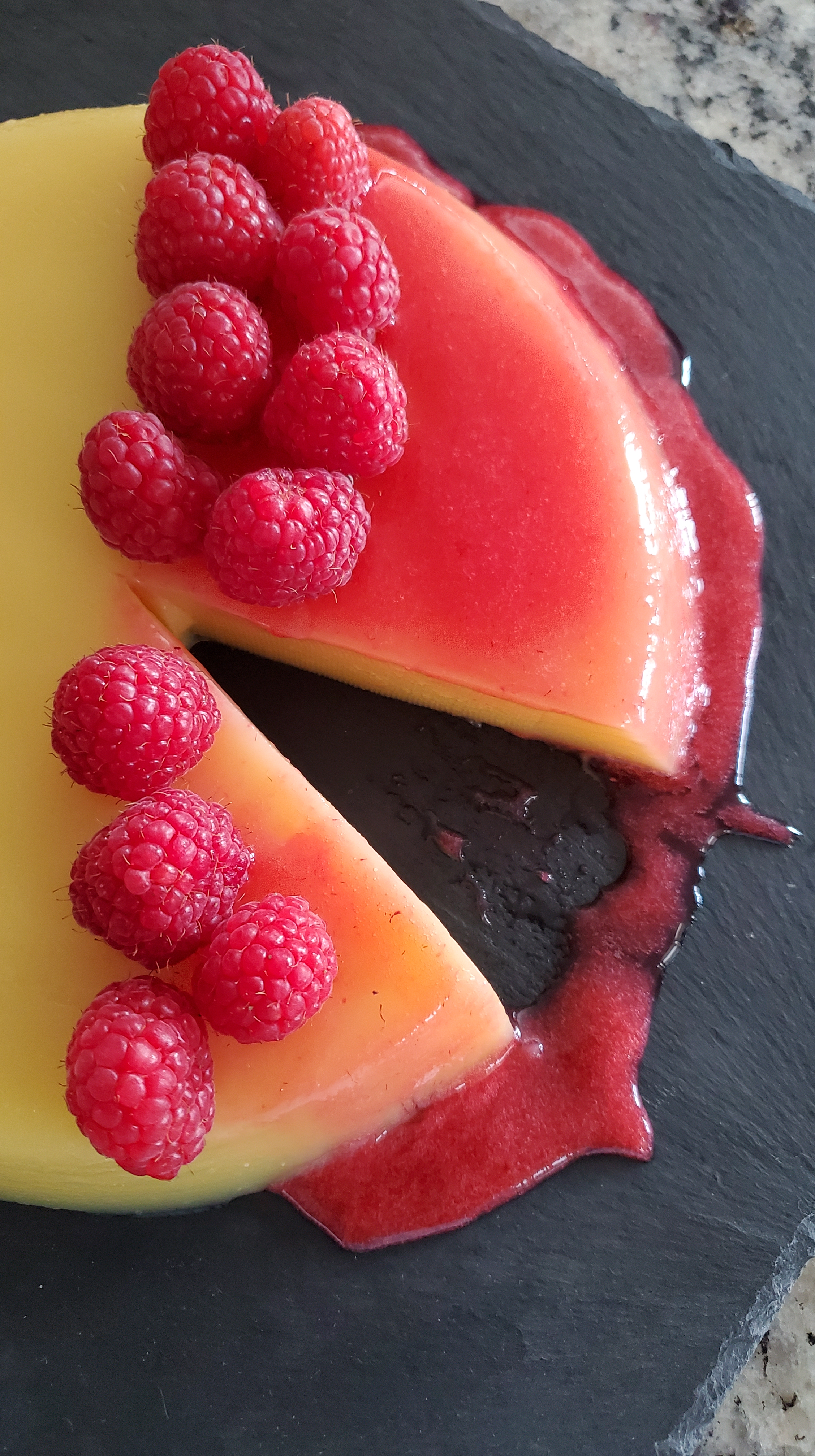 Run a butter knife around the rim of the dish and invert the masghati onto a serving platter. Serve cold, topped with the raspberry sauce, and garnished with the remaining raspberries.