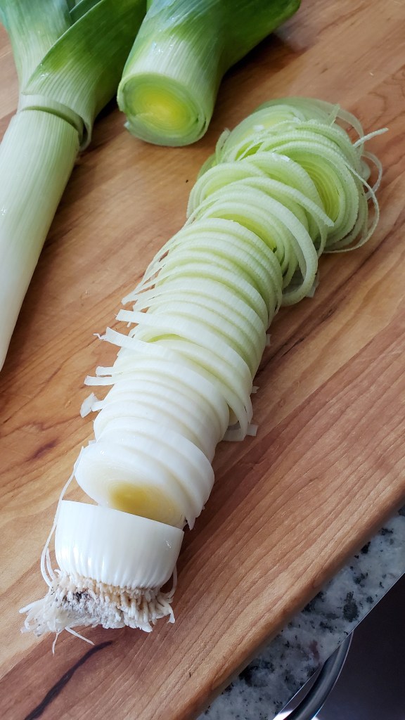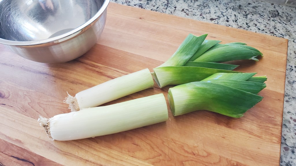 First of all, you don’t want to eat the thicker, dark green ends, just the white and lighter green parts. Secondly, leeks have quite a few layers, and dirt gets trapped inside those layers very easily. It’s important to expose and rinse them thoroughly before cooking with them.