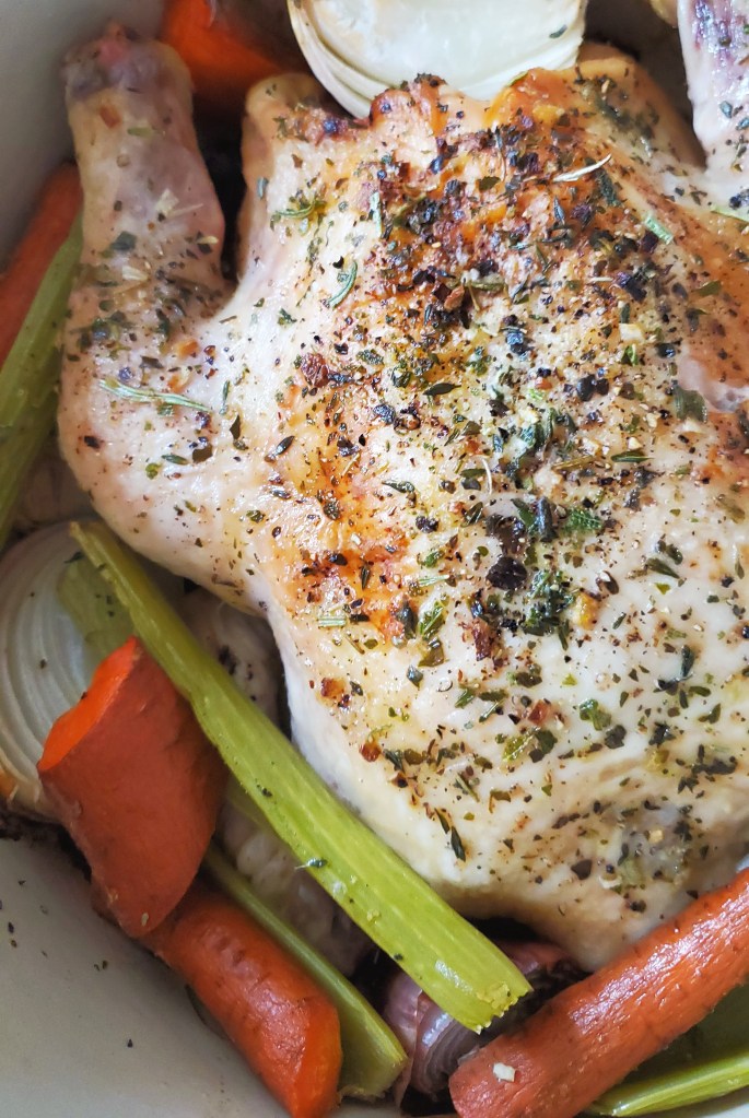 Place the carrots, celery, and remaining onions and garlic in a roasting pan. Toss with remaining poultry seasoning, salt, pepper, and olive oil. Spread around the bottom of the roasting pan and place the chicken on top. Tuck the wing tips under the body of the chicken to keep them from cooking too quickly. Roast the chicken for 1-1/2 hours, or until the breast registers 165F on a thermometer.