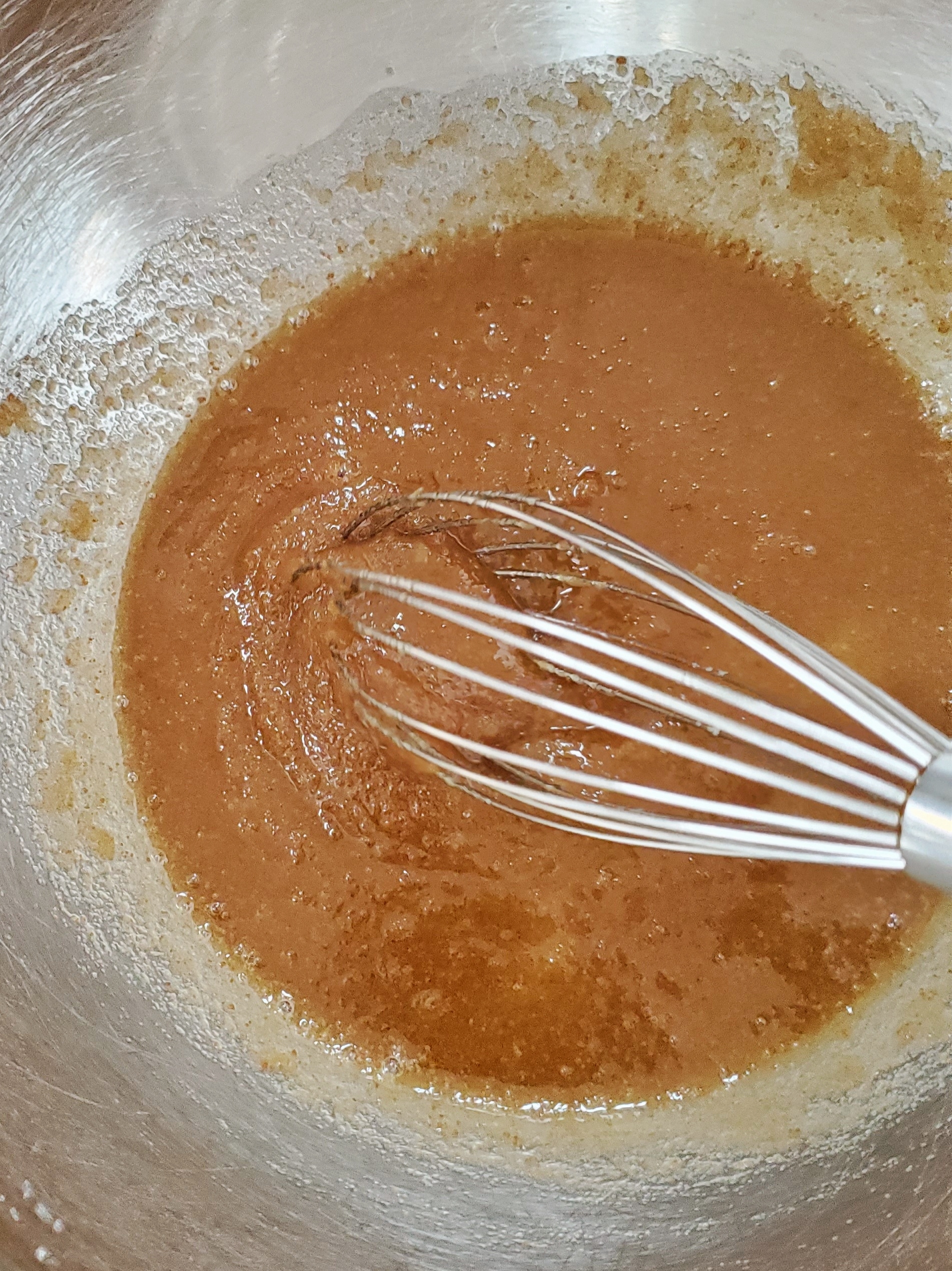 Once butter has cooled, add both sugars to the first bowl and mix. Add the room temperature egg and vanilla extract to the bowl and mix until it becomes a smooth, brown texture.