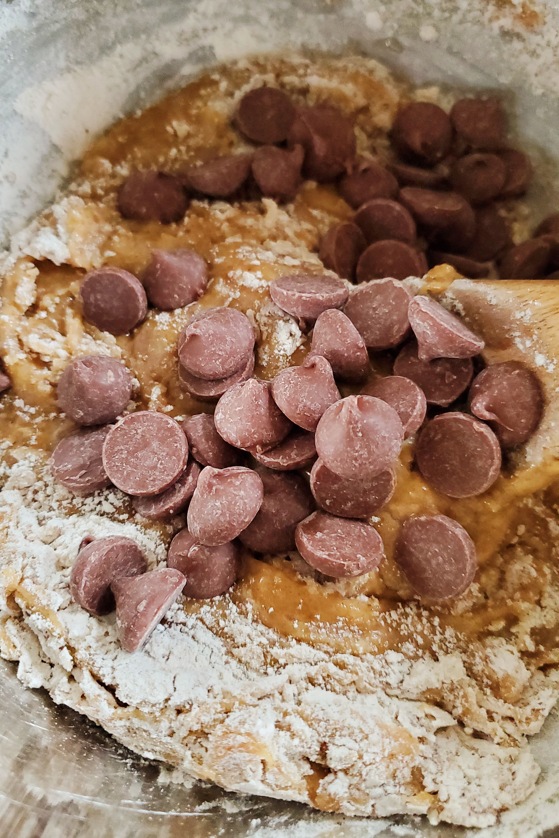 Gently fold the dry ingredients into the wet ingredients. To insure you don’t overmix, stop when there’s a little bit of flour left. Add 1-1/2 cups chocolate chips and mix until everything is just incorporated.
