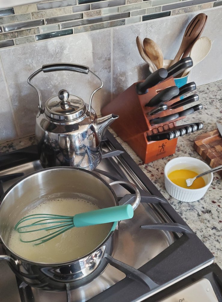 To temper the eggs, add a spoonful of the hot mixture into the egg yolks and stir well. Repeat this process with two or three more spoons of the hot mixture added to the egg yolks. This will prevent the eggs from scrambling when added to the saucepan. Pour the egg mixture into the saucepan and stir well. Bring mixture to a gentle boil and cook for two more minutes. Remove from heat.