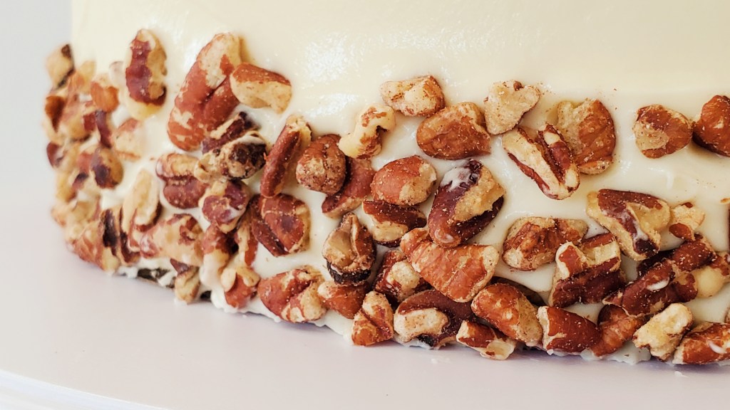 In another large bowl, sift the flour, baking powder, baking soda, salt, cinnamon, nutmeg, and cloves together. Pour the dry ingredients into the wet ingredients and gently fold the ingredients together until just combined. Fold in the carrots and pecans.