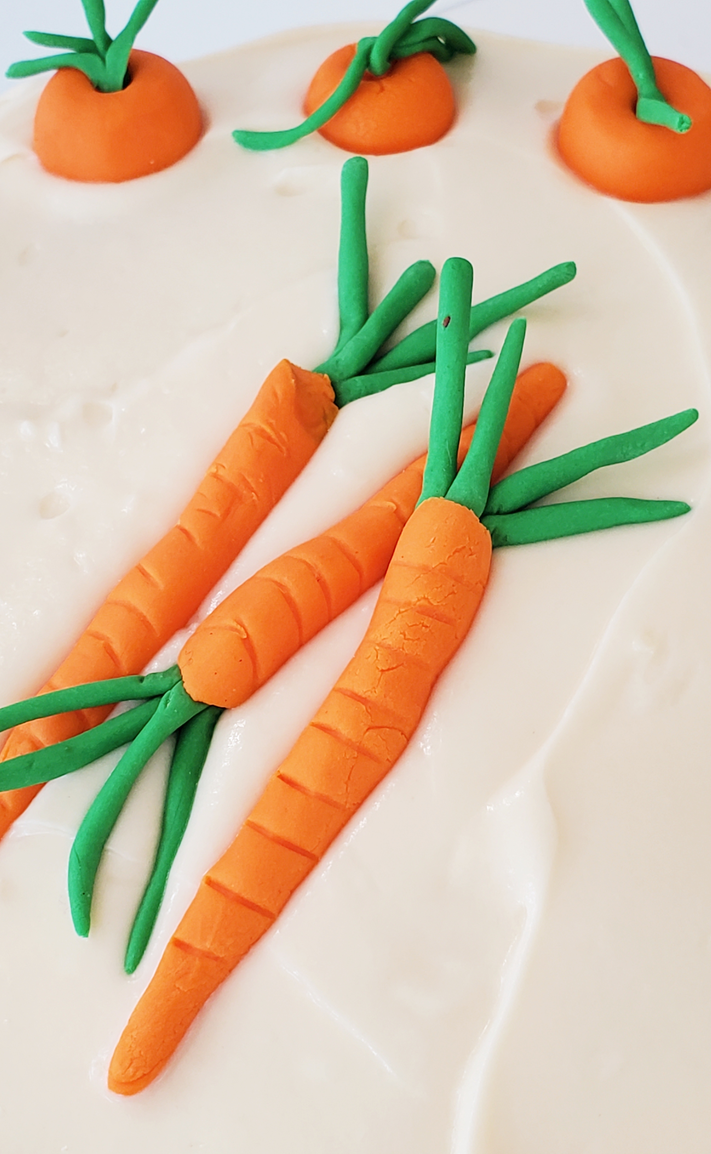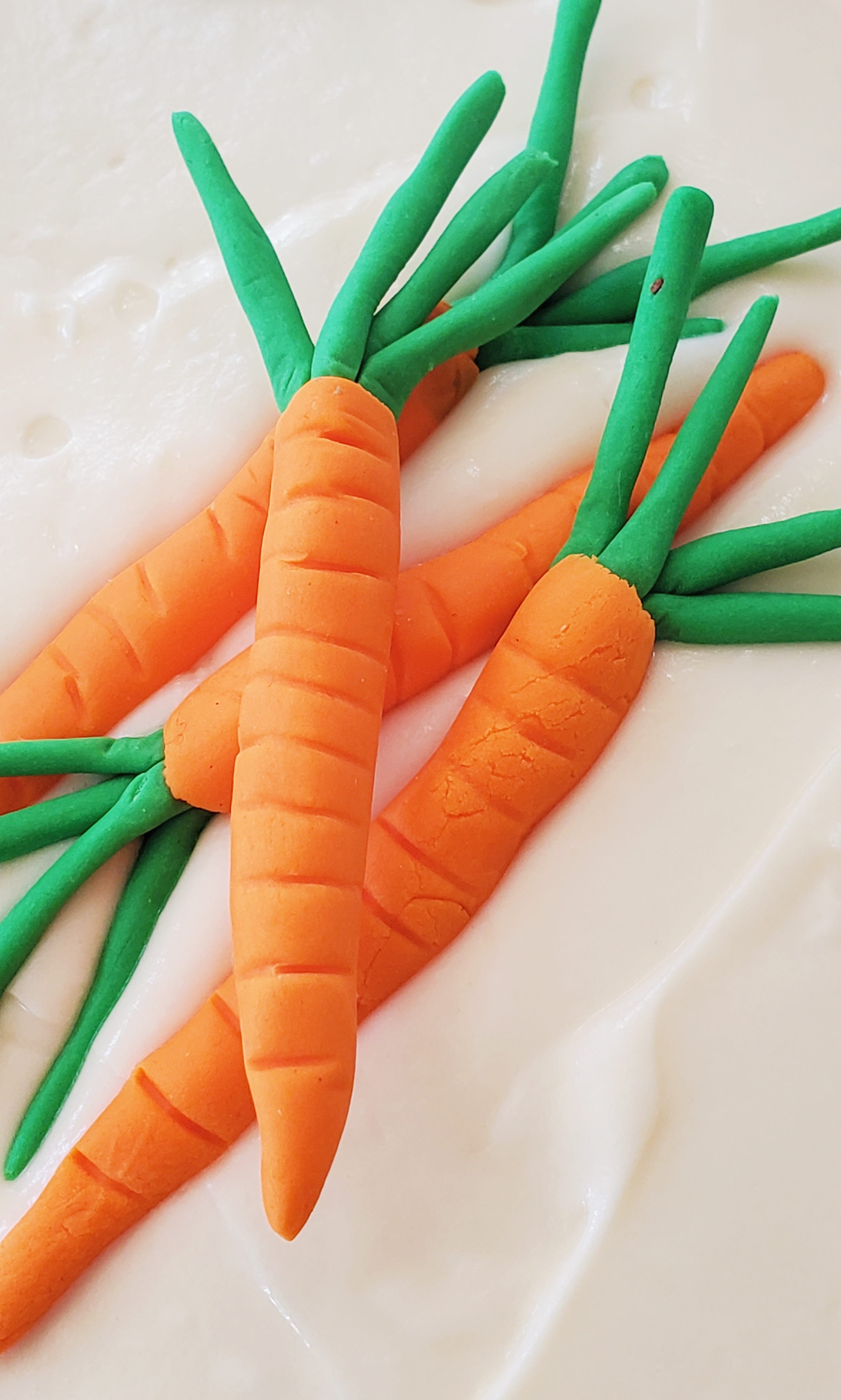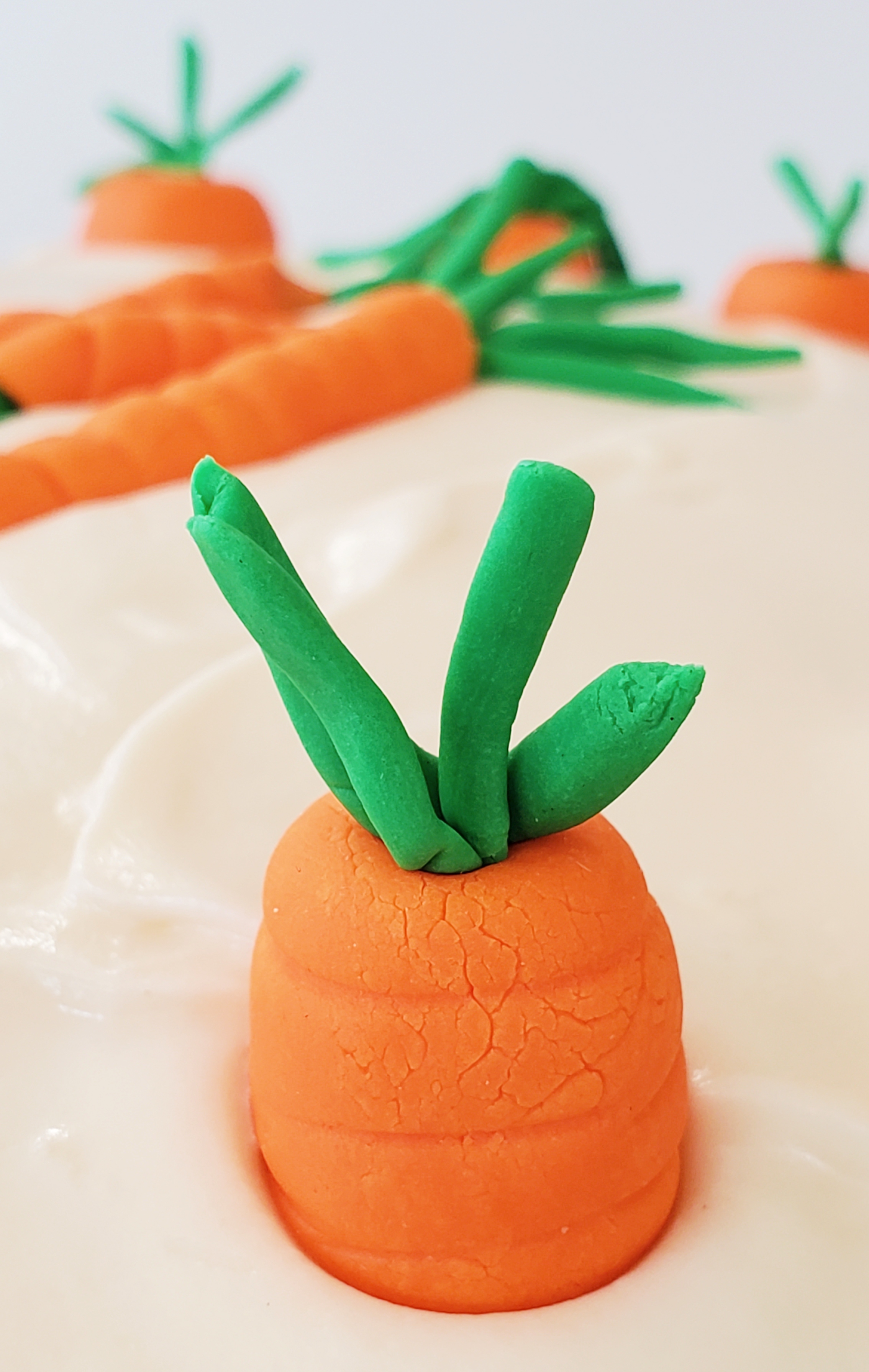 I also decided to try fondant decorations for the first time. Since this was my first time working with fondant, I purchased premade so I could get a feel for the proper texture. After some research, I learned that Satin Ice is a dependable brand of premade fondant. My resulting carrots weren’t perfect by any means, but not bad for a first attempt! I look forward to working with fondant more, and plan to eventually learn to make my own.