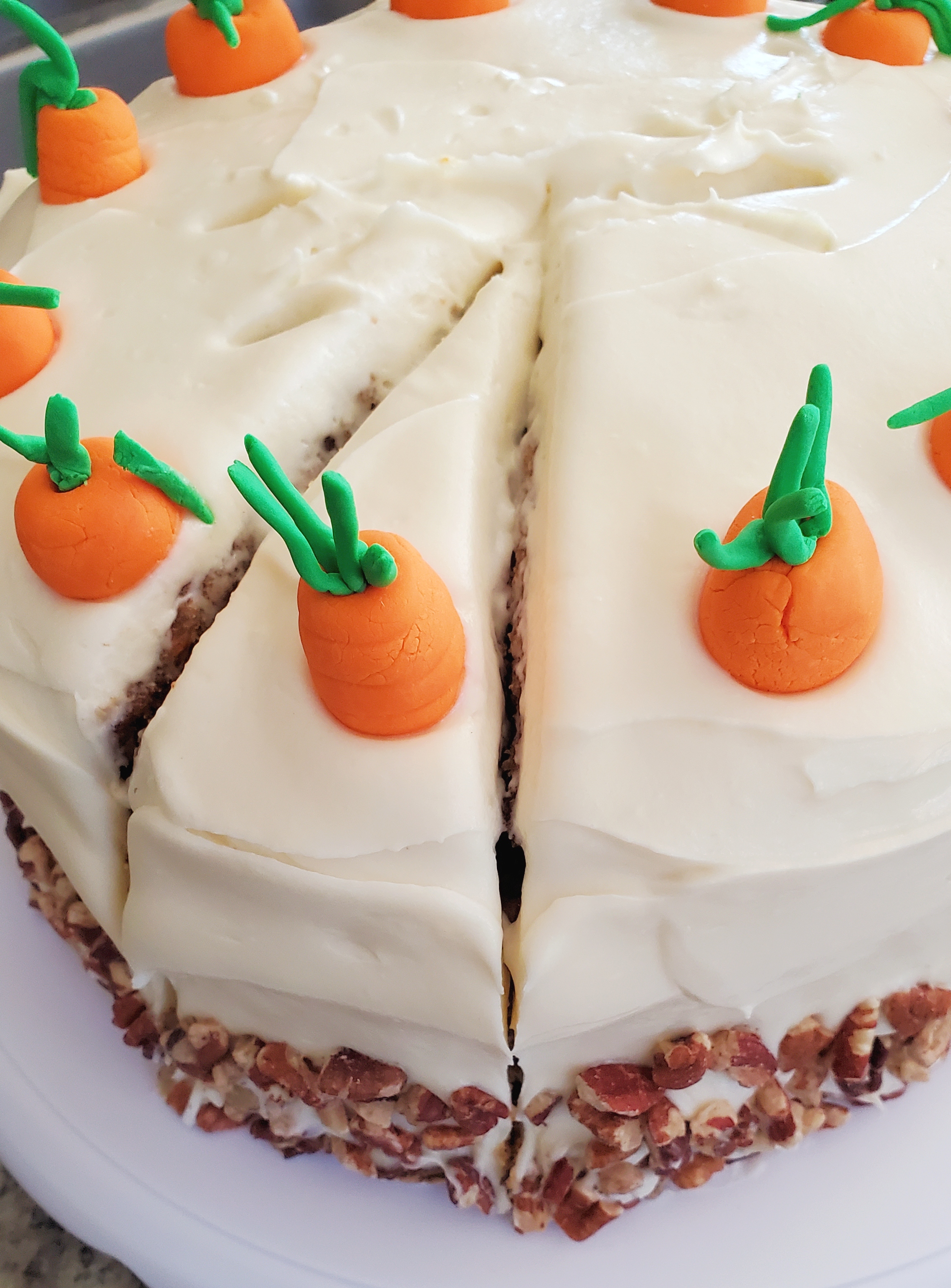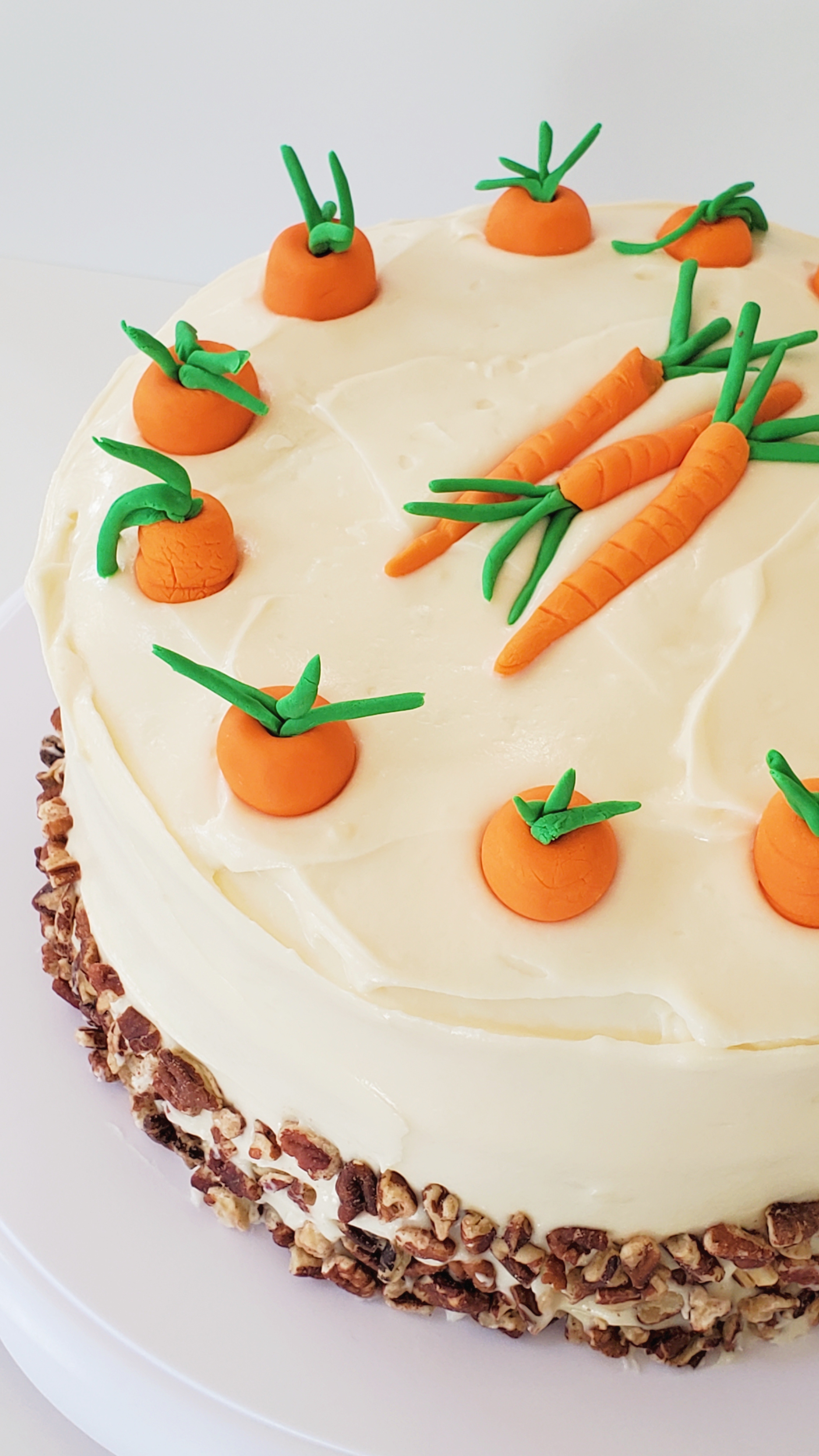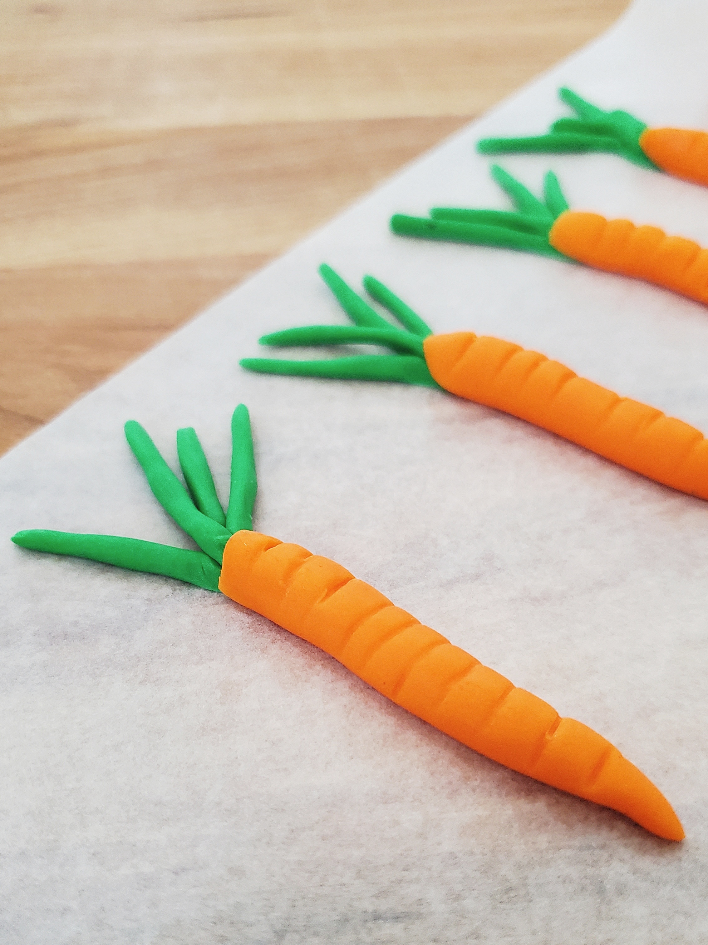 I also decided to try fondant decorations for the first time. Since this was my first time working with fondant, I purchased premade so I could get a feel for the proper texture. After some research, I learned that Satin Ice is a dependable brand of premade fondant. My resulting carrots weren’t perfect by any means, but not bad for a first attempt! I look forward to working with fondant more, and plan to eventually learn to make my own.