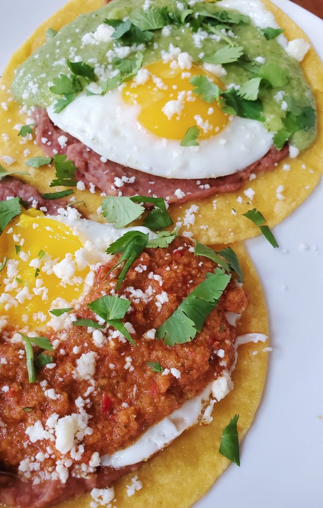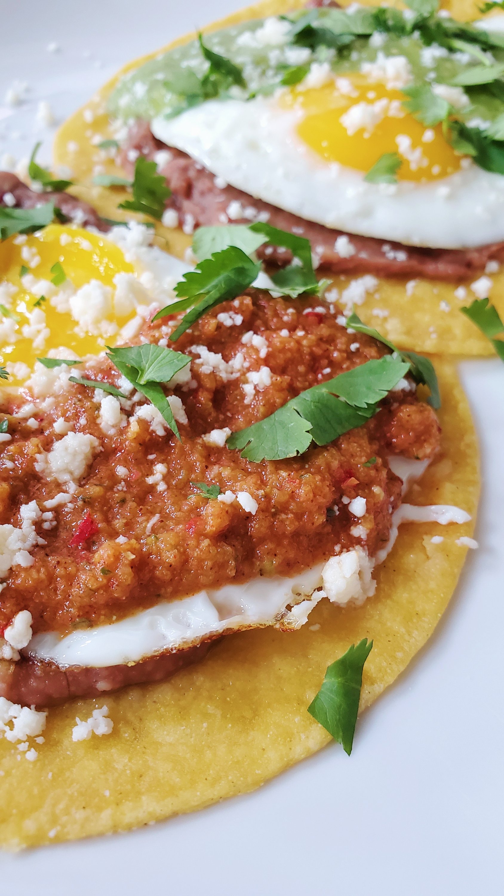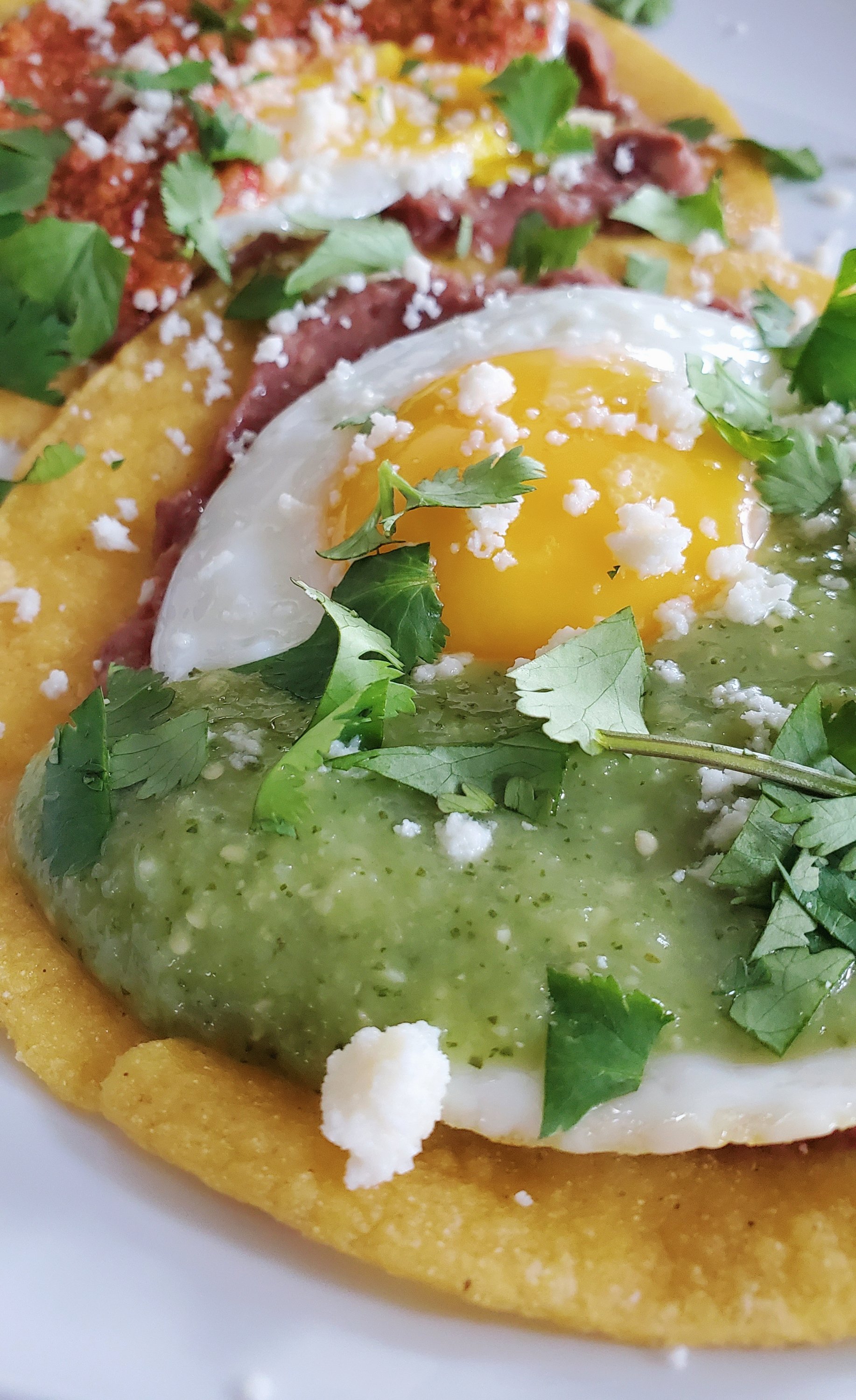 Gently place one egg on top of two separate tortillas. Spoon your desired amount of warm salsa verde on top of the egg white on one tortilla, leaving the yolk exposed. Repeat with the warm salsa roja on the other egg. Season with salt and garnish with a pinch or two of crumbled cheese. Serve immediately.