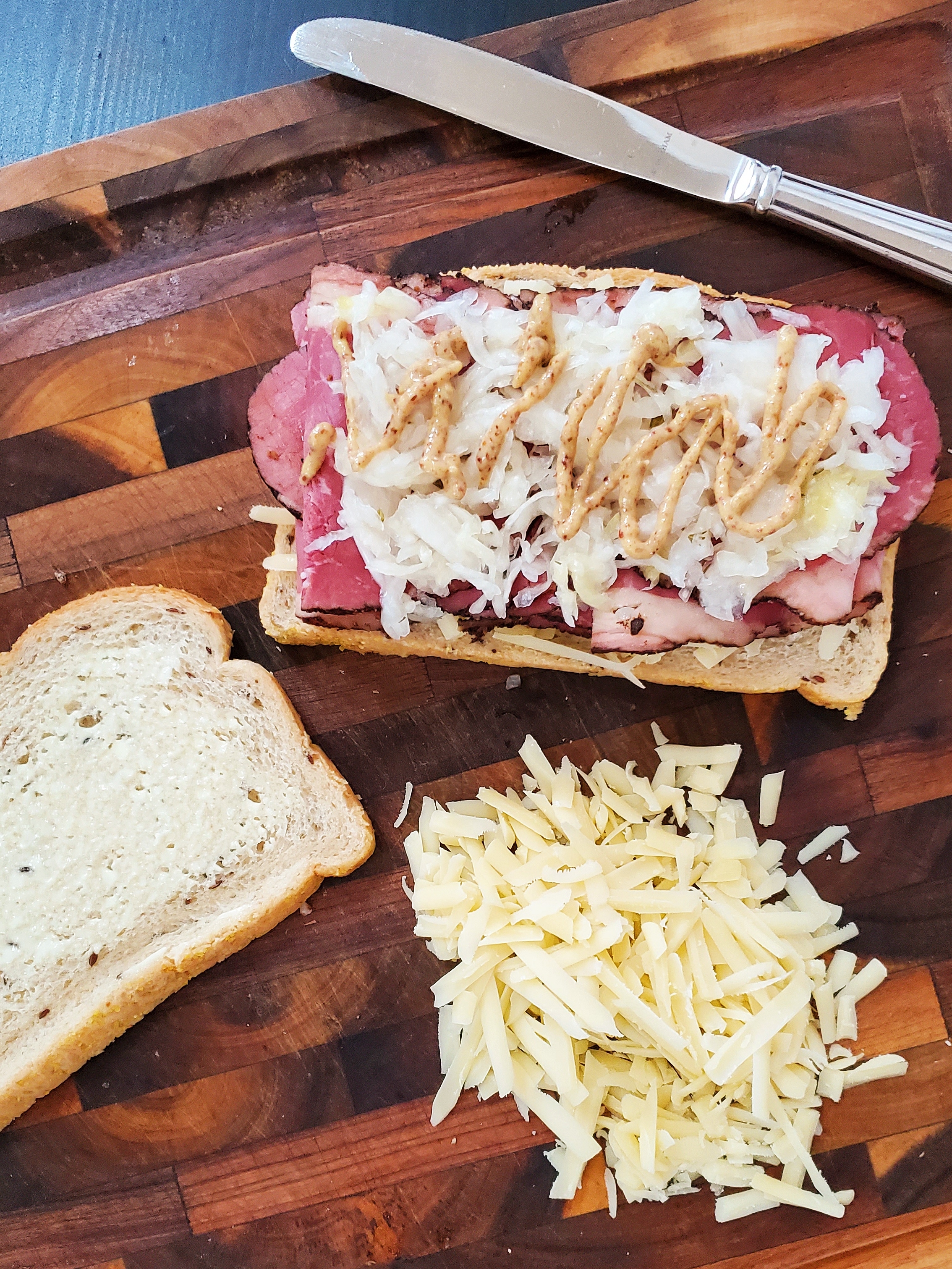 Build your sandwich on one side: sliced cheese, sliced pastrami, a squeeze of whole grain mustard, a hearty dollop of sauerkraut, and a second piece of cheese. Place the second piece of bread on top with the mayo on the inside and the butter on the outside.