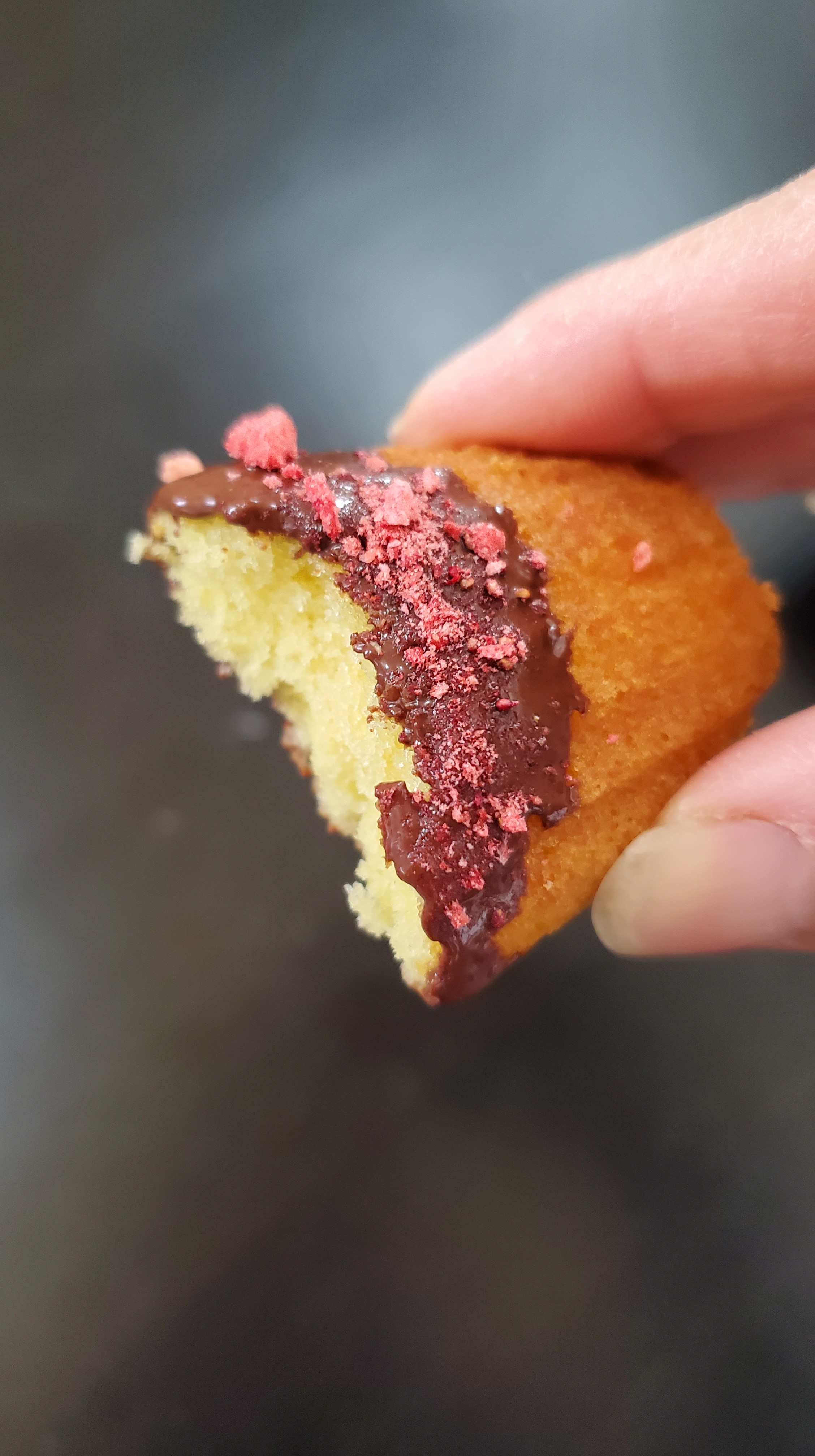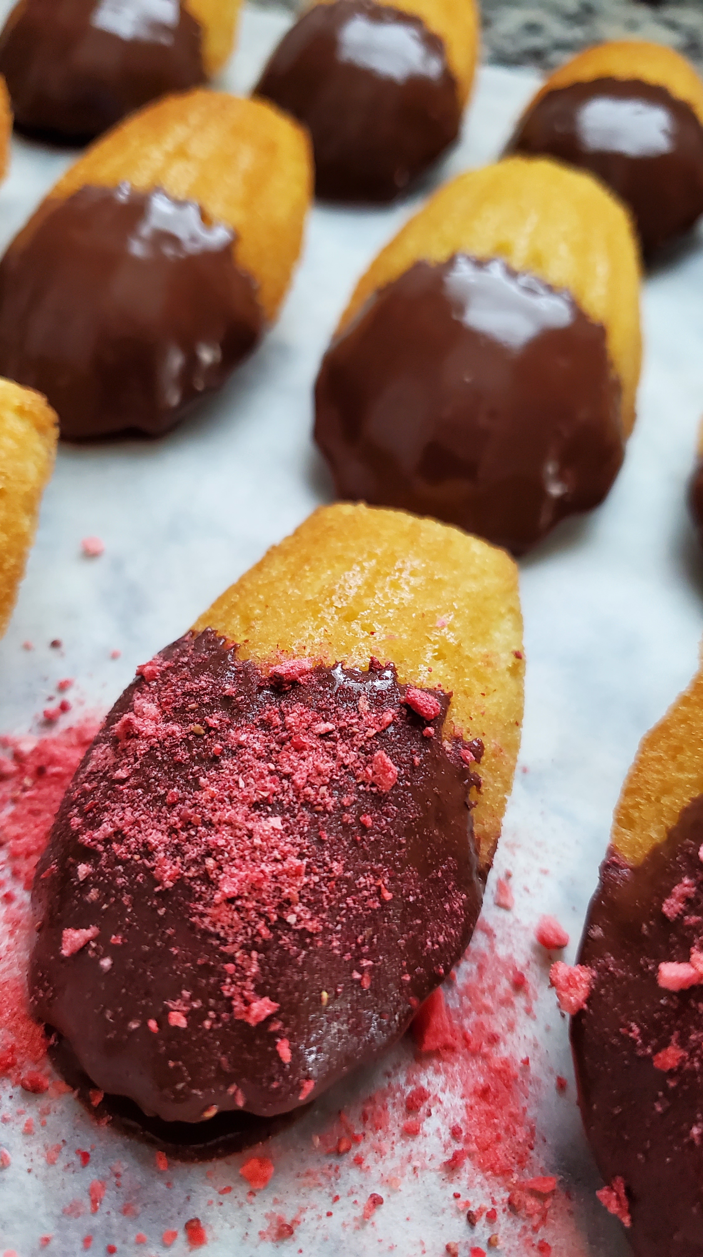 This recipe is for classic vanilla Madeleines dipped in a simple chocolate ganache, but these cakes are incredibly versatile! You can add flavors in the form of extracts, zests, fruits, powders, and dips. I’ve also included the option of sprinkling crushed freeze-dried strawberries to add an extra fruity zing!