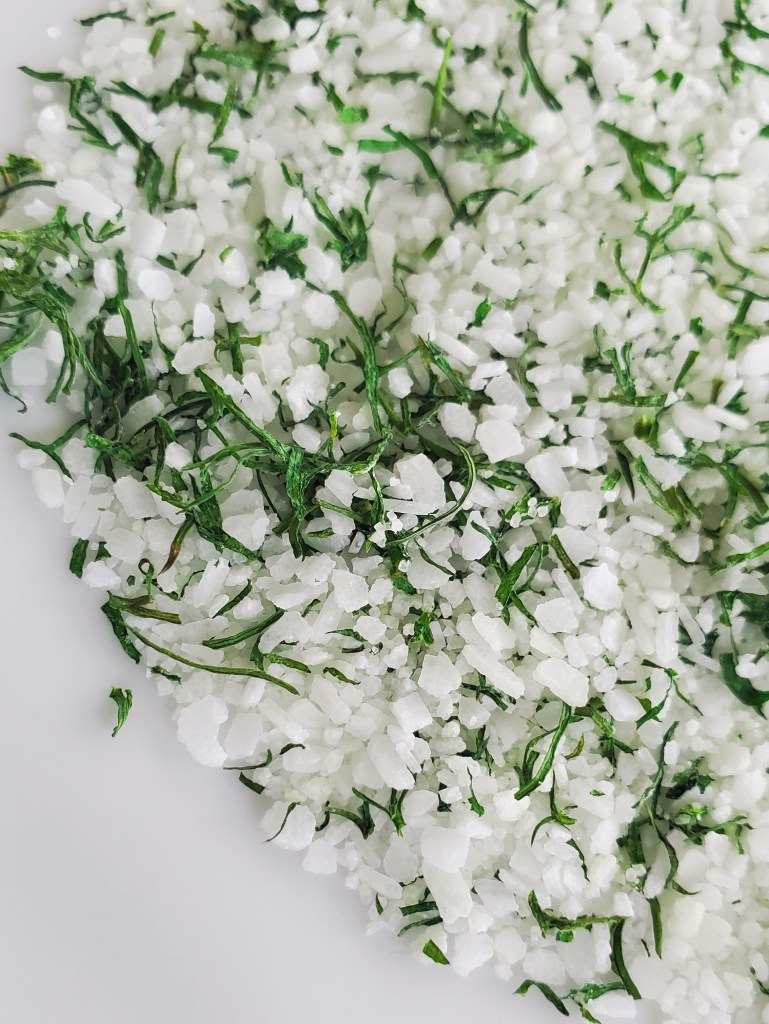 One of the ways to use up extra herbs from your garden is to make herb salts. So easy, so quick, and so flavorful! Simply chop the herb of your choice, lay it out on a sheet pan with salt, use your fingers to crush and combine it all, and set it out to dry for several days.