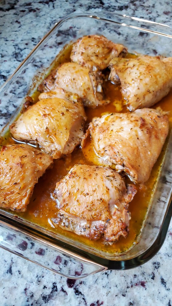To make it even better, this particular recipe uses bone-in chicken thighs, whose dark meat lends even more juiciness. Added chicken stock further ensures the meat will not dry out. As a result, this chicken is unbeatably moist, flavorful, and even makes great leftovers!