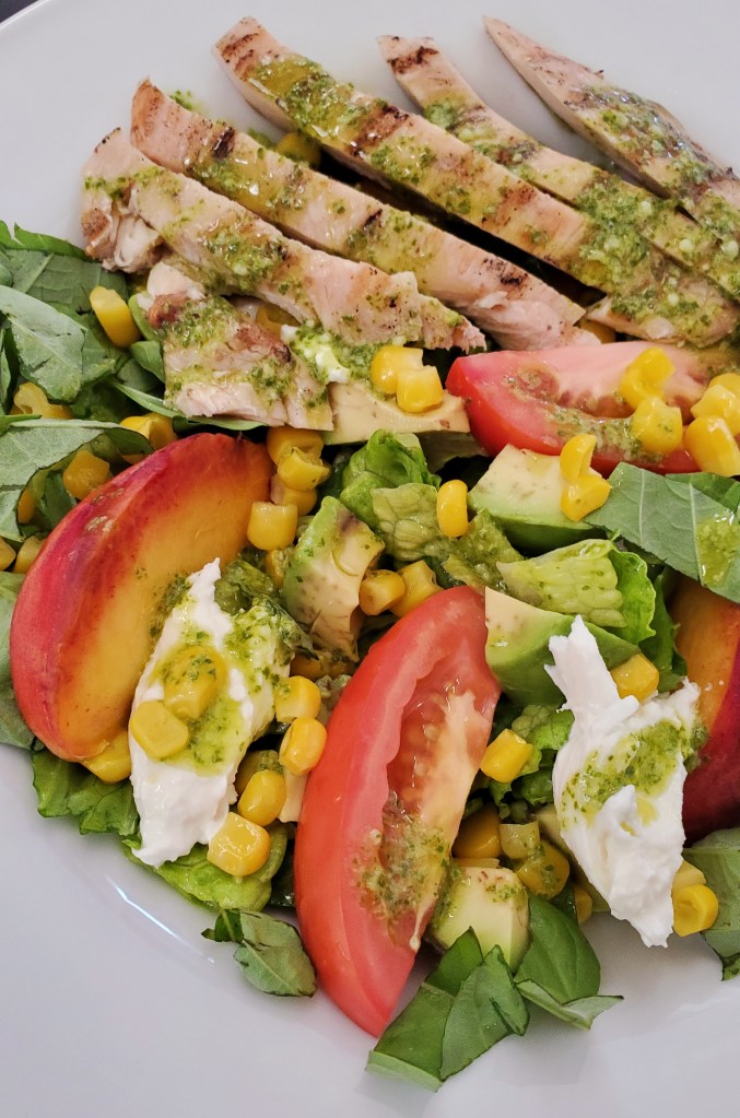 Early summer is filled with so many delicious fresh flavors, and Honeysuckle Cookbook’s Summer Sunset Salad is a fantastic way to celebrate them! Fresh summertime fruit and veggies, creamy cheese, chargrilled chicken, and zingy basil dressing tastes like summer in a bowl!