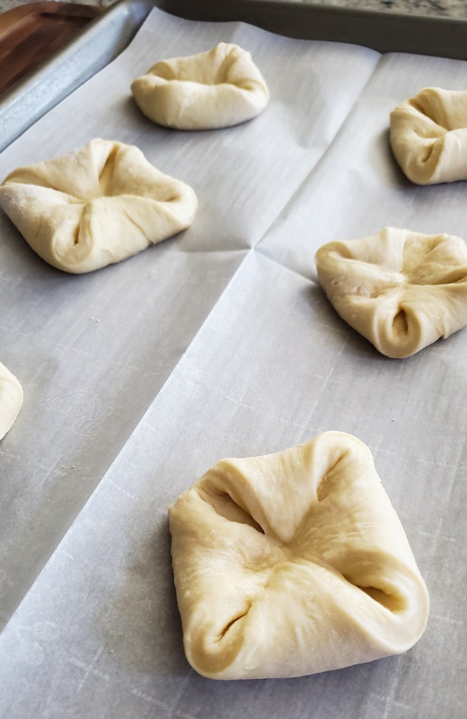 Place the squares of dough onto parchment-lined baking trays (6 on each), then fold each of the corners into the center of each square. Press down lightly with your palm. Let them rest for 10-15 minutes.