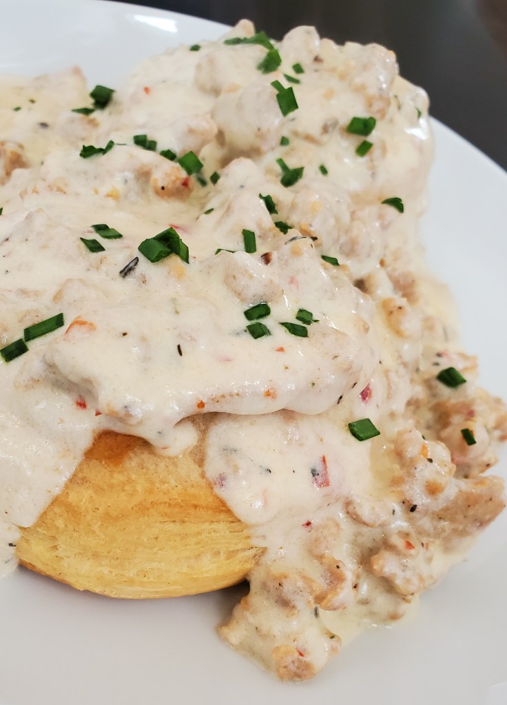 My husband has been so supportive lately that when he requested biscuits and gravy, I was eager to oblige, even in hot summer weather. Since he enjoys a kick of heat in his food, I made this gravy a little spicier using a hot type of sausage and red pepper flakes.