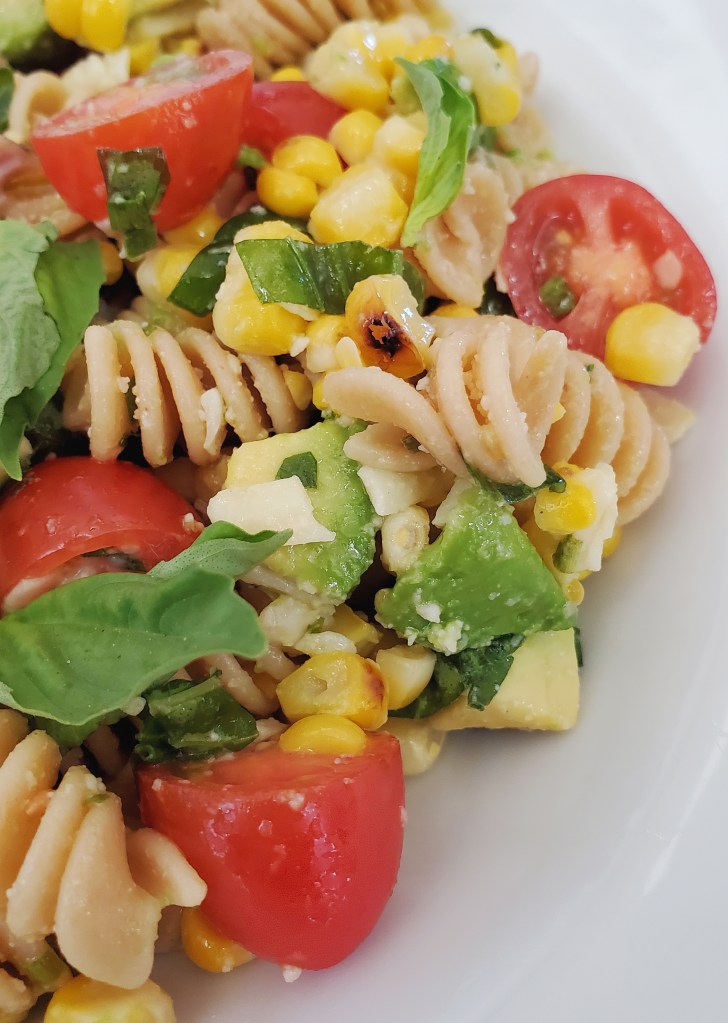 Talk about summer harvest in a bowl! This filling pasta salad celebrates everything we love about summer flavors. Juicy tomatoes and tart lemon juice balance fresh basil, salty cheese, and creamy avocado. Grilling the chicken and corn gives the salad that char-gilled summer flavor, all balanced by the whole wheat pasta. In addition to delicious, this dish is filling; we had leftovers for several days!