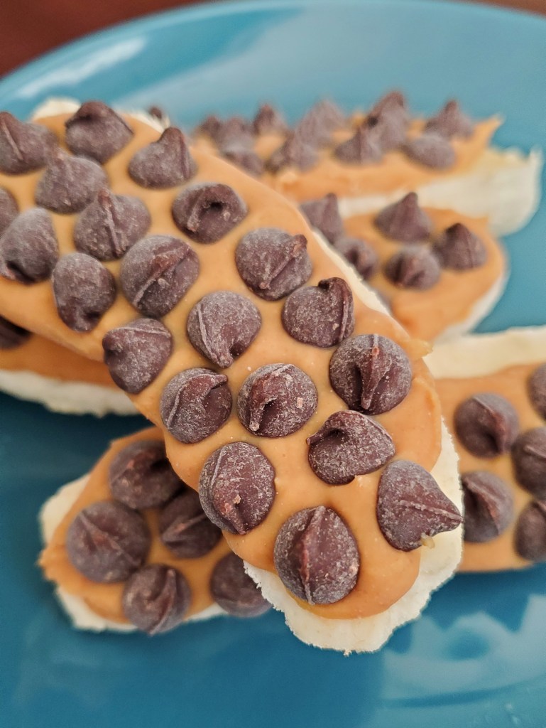 I use simple chocolate chips to keep this assembly quick and easy, but if you’re feeling industrious, melt the chocolate and spoon it on top of your peanut butter-covered banana. Or go crazy and dip the whole thing in the chocolate to enrobe it! If you choose this option, I would recommend freezing the banana and peanut butter before covering in chocolate and returning to the freezer.