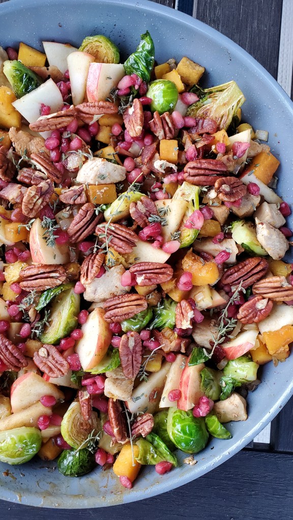 Balancing squash, apples, sprouts, and pomegranate with protein-packed chicken and pecans, this filling meal is packed with nutrients and autumn flavors. Even better, it’s a one-skillet dish, meaning easier clean up!
