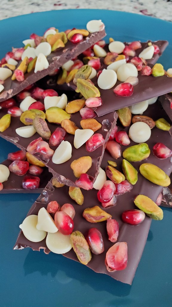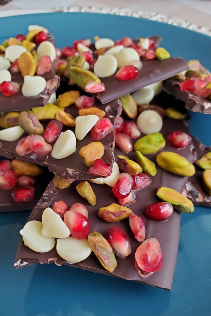 Have you seen the new fall 2022 pomegranate-flavored sweet treats at Williams Sonoma? They look so tempting! However, with a little effort, you can make these seasonal goodies at home, saving money and offering more opportunities to customize to your preferences. The fastest and easiest of these is this Pomegranate Pistachio Chocolate Bark.